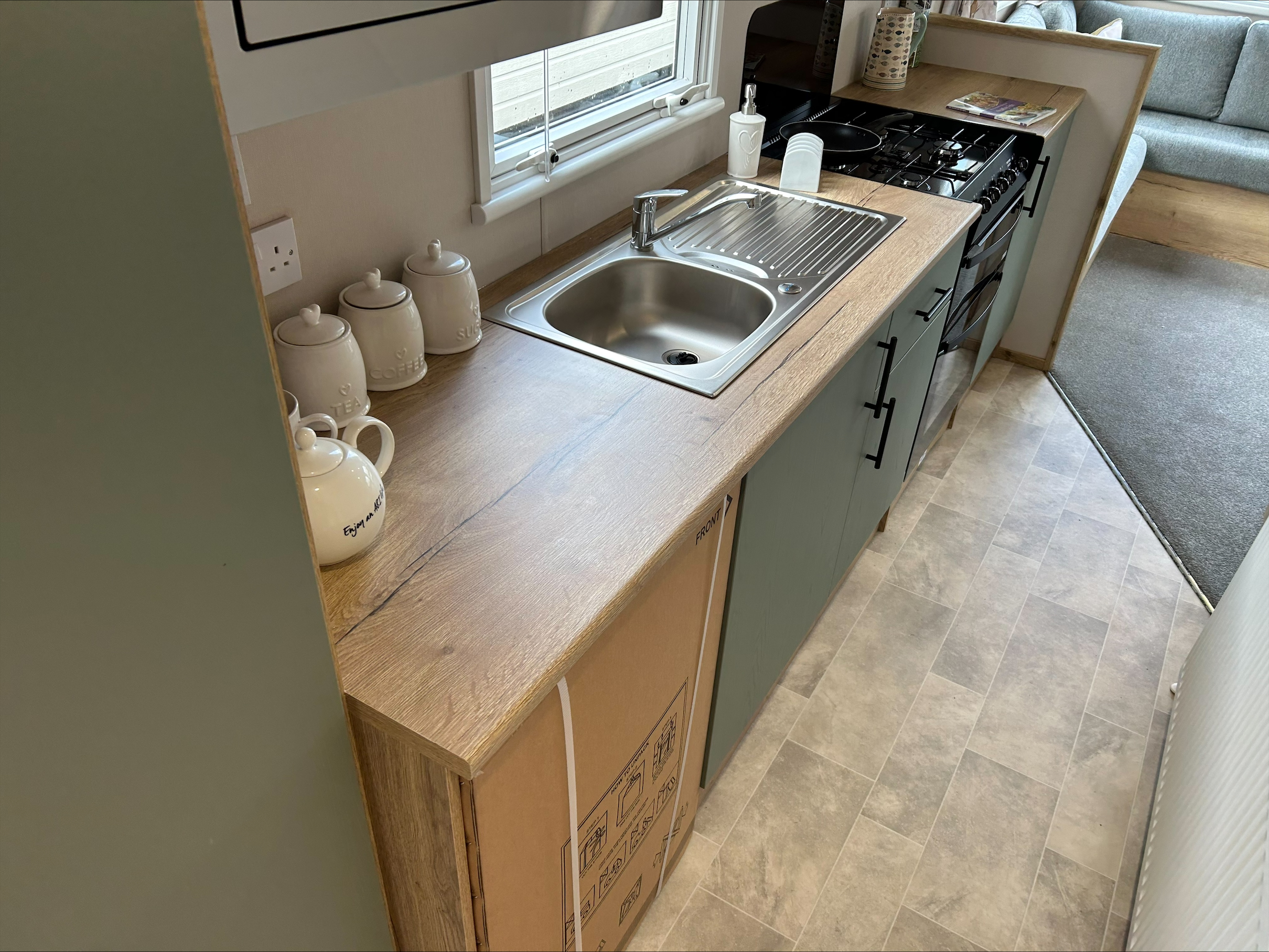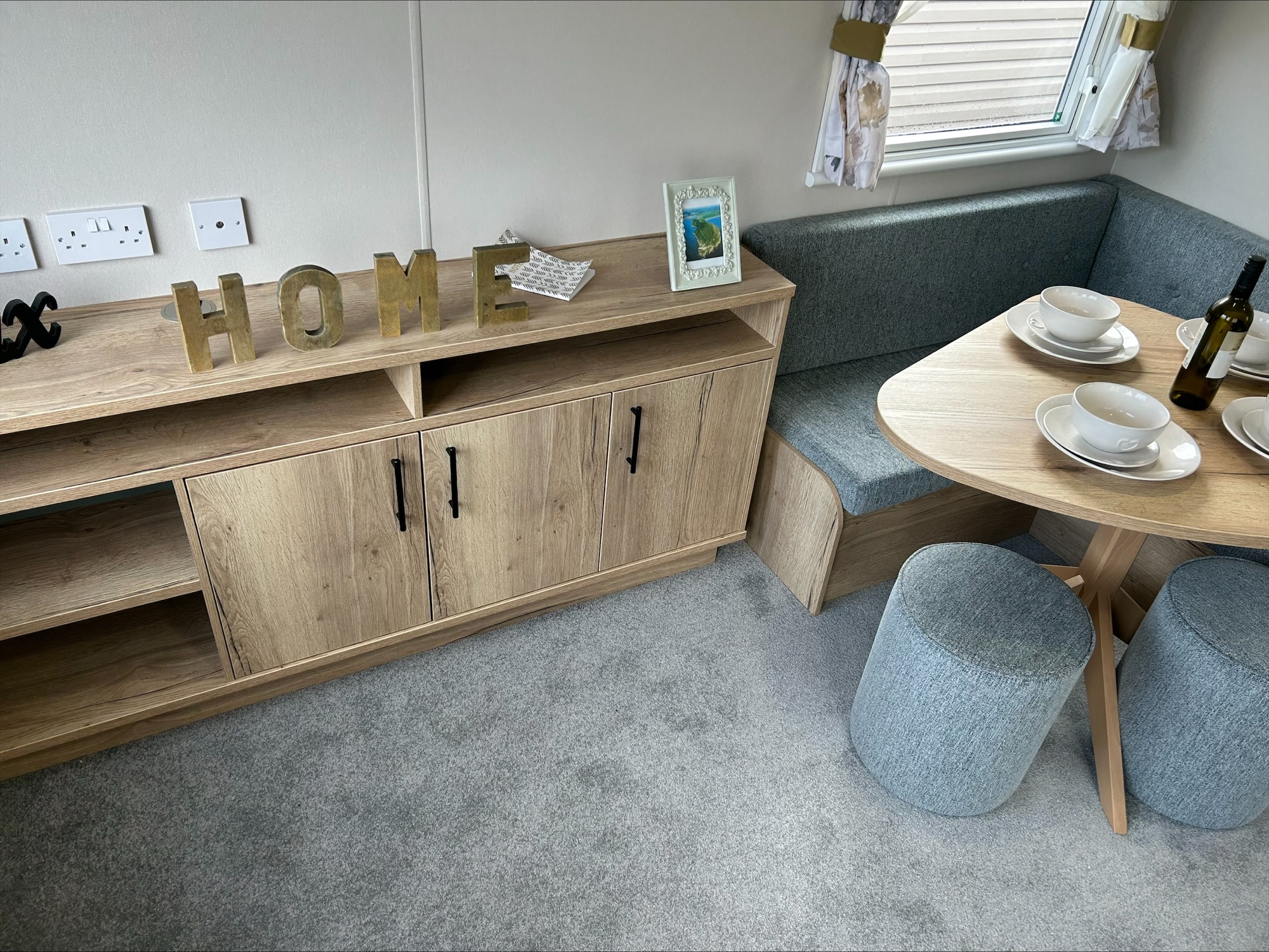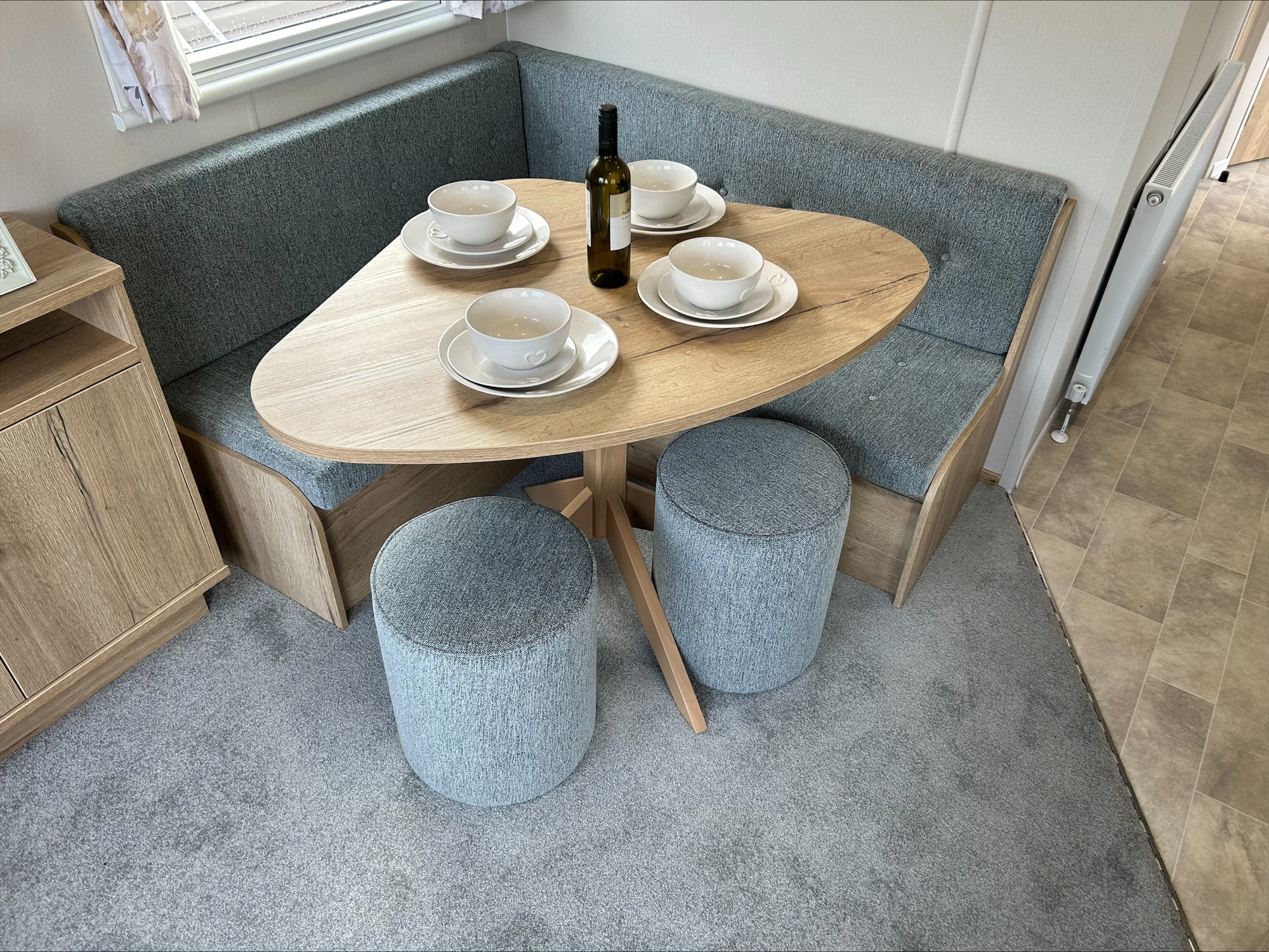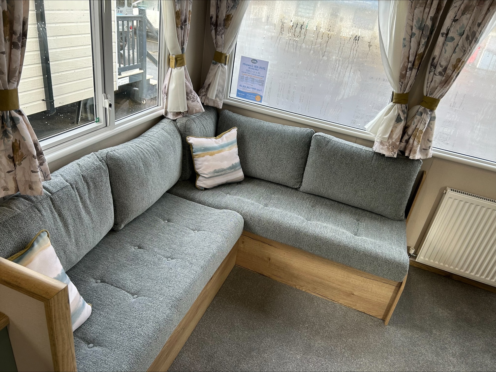 Step inside and you're greeted by a bright, open-plan living area that feels welcoming from the moment you arrive. The fixed seating is designed for comfort and with scatter cushions included, you have the perfect place to relax after a day of exploring. Net curtains throughout let in plenty of natural light while still giving you privacy.