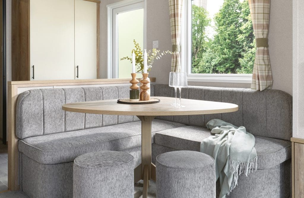 Inside, the open-plan lounge is light and welcoming, with fixed seating, a stylish entertainment unit, and scatter cushions to add a homely touch. Large windows ensure a bright and airy feel.
