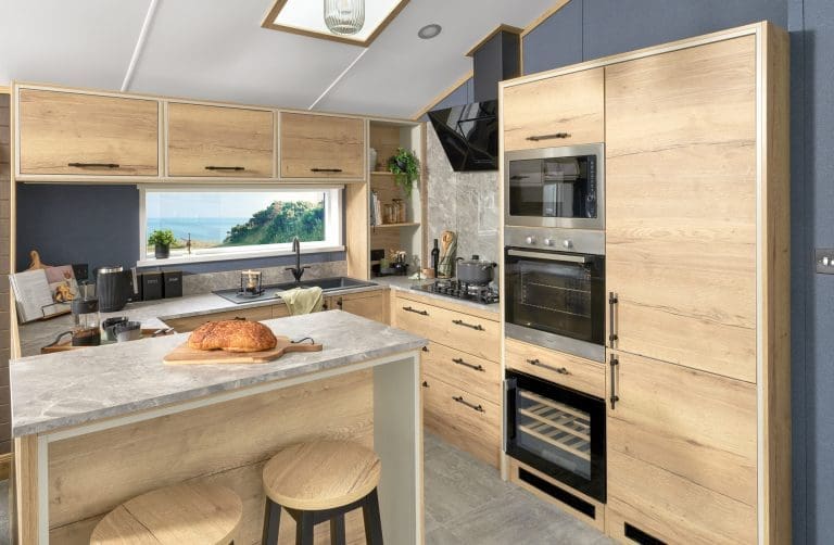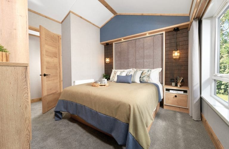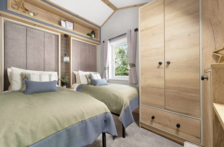 The master bedroom is beautifully appointed with a king size lift-up bed, bedside USB sockets, a TV point and stylish feature wood panelling. The twin room offers 3ft single beds and both rooms include plain duvet covers, pillowcases, throws and also scatter cushions for a luxury finish.