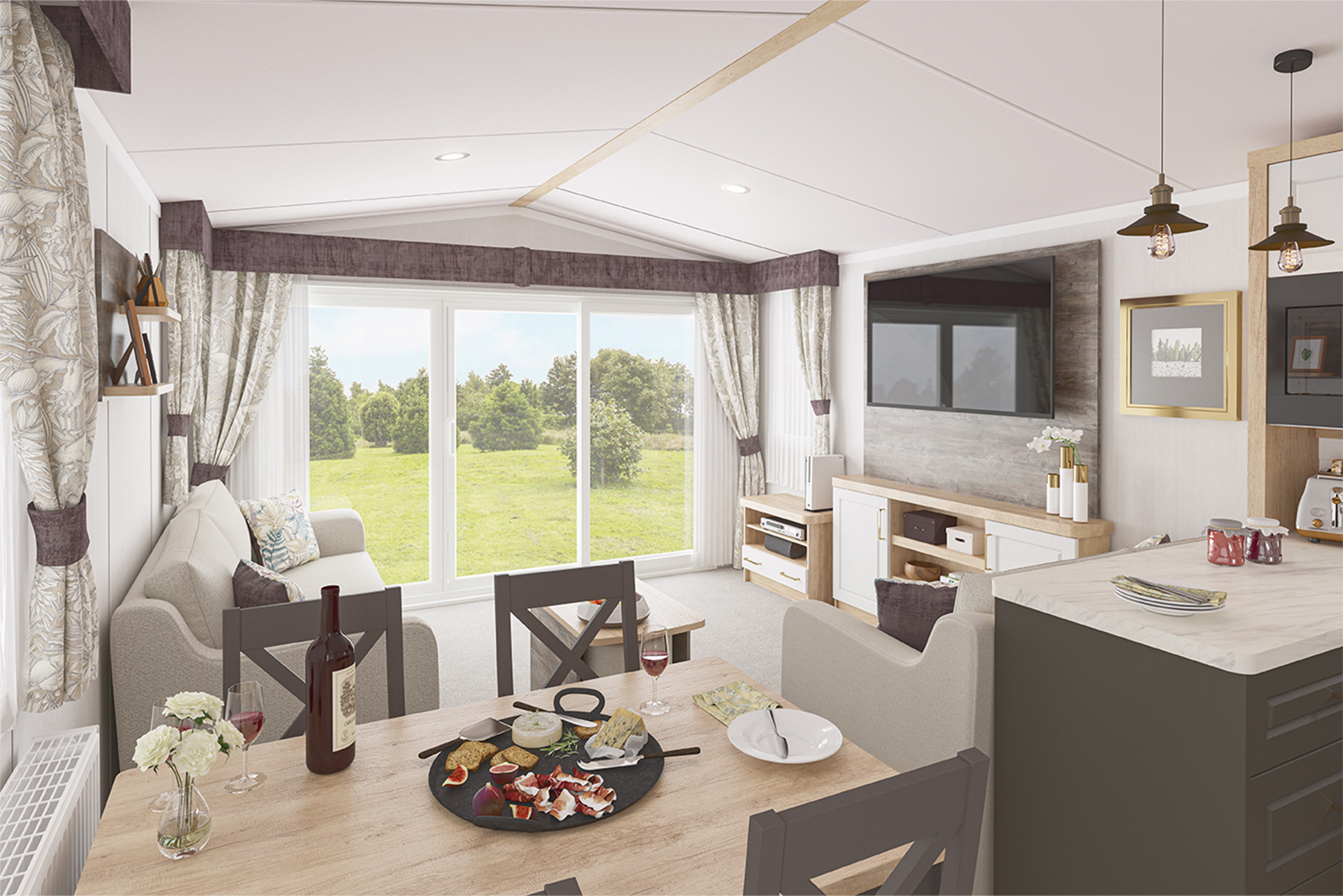 Inside, the warm Nebraska Oak woodgrain and Sousel soft furnishings create a homely yet sophisticated atmosphere. The spacious lounge includes a freestanding two-piece suite with a fold-out occasional bed, scatter cushions, a TV unit with storage and a coffee table with two upholstered stools neatly tucked beneath. Large windows fill the space with light, complemented by voiles and LED lighting throughout.