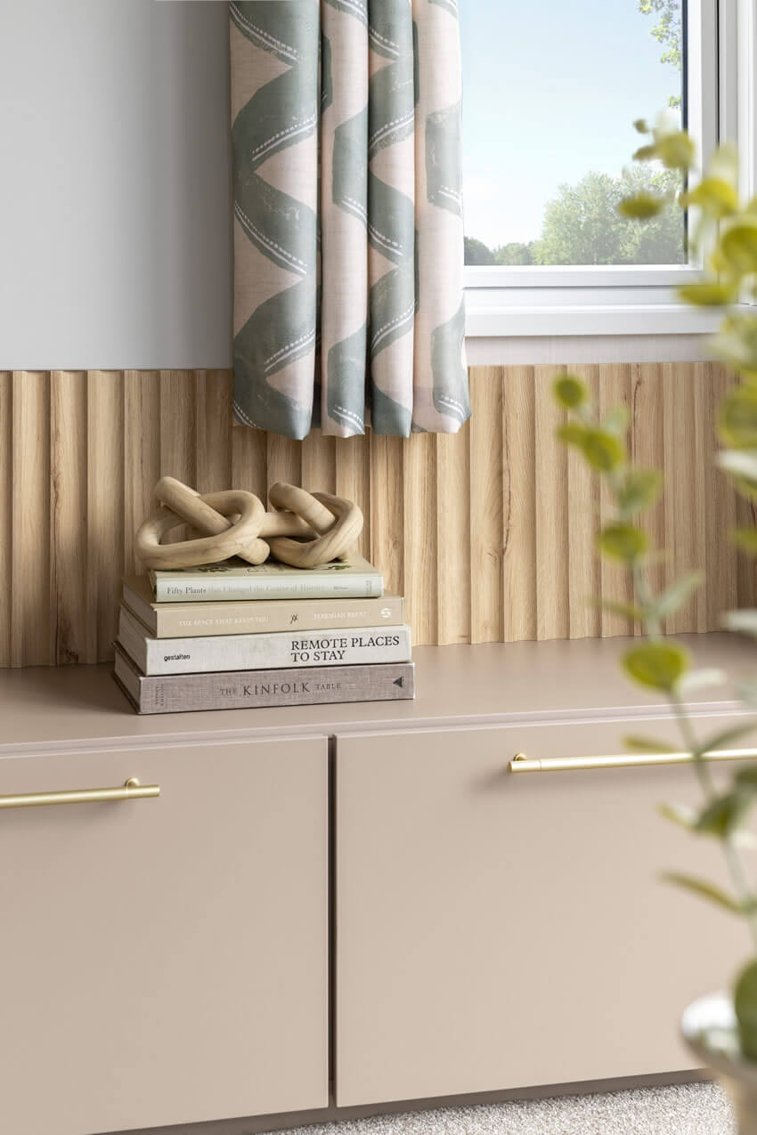 - Nebraska Oak woodgrain with Almond Beige feature panels
