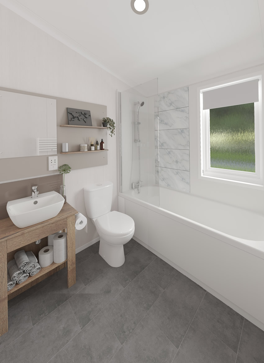 A family-sized bathroom with a domestic bath, thermostatic shower and dual flush WC alongside an ensuite shower, ensures the highest level of comfort. The Montreal Lodge is the perfect choice for those seeking a refined, year-round retreat with exceptional space, design and style.