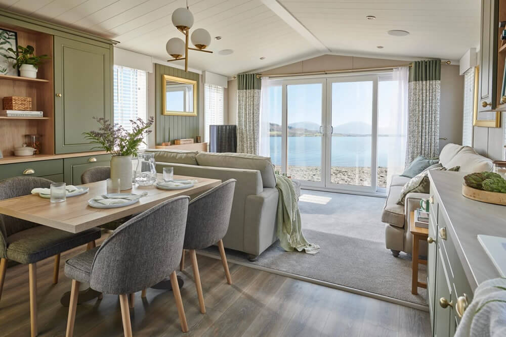 Inside, the refreshed Country Cottage interior scheme with Cypress soft furnishings creates a warm and inviting atmosphere. The lounge features freestanding two and three-seater sofas with scatter cushions, an ottoman footstool with storage and a stunning 2kW Optiflame electric stove fire beneath a statement mirror. Finishing touches such as white wooden blinds framed wall art and a feature coffee table add to the refined aesthetic.