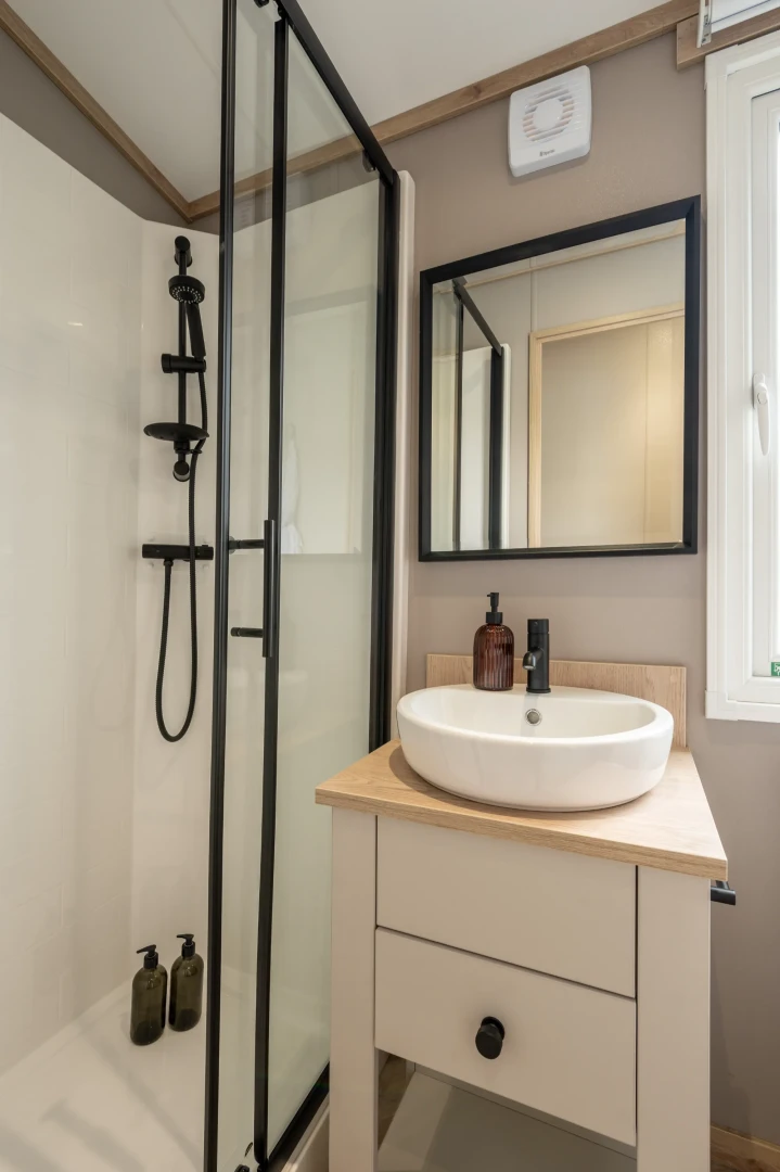 The bathrooms are fresh and contemporary, combining matt black fixtures with soft wood tones and spa-like finish, while the bedrooms are calm, comfortable retreats. The master suite offers a statement headboard, mirrored wardrobes and dressing area, while additional twin rooms in the 8-berth layout provide flexible sleeping arrangements for family or guests.