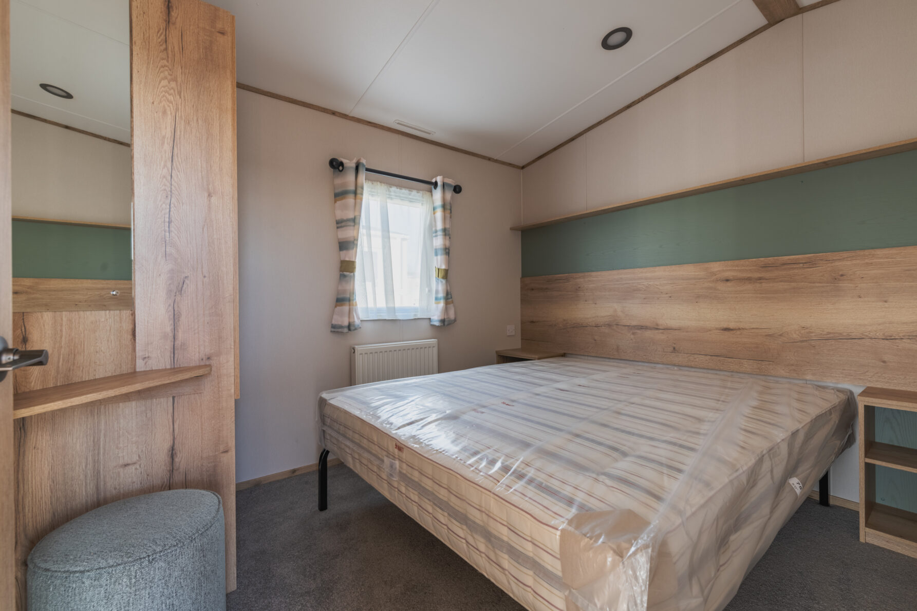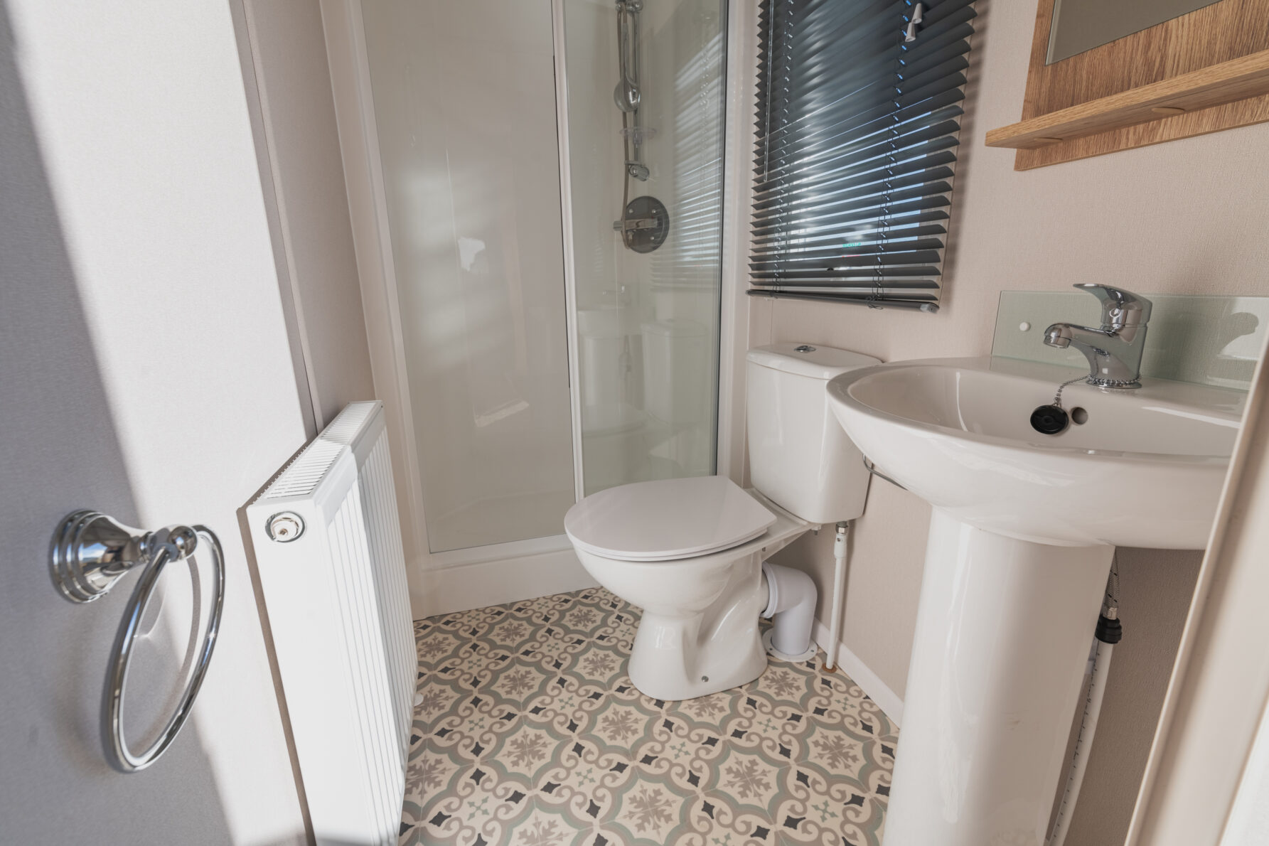The two bedrooms are light, modern and spacious continuing with the same colour theme throughout the Holiday Home, featuring the country-style wood effect on the fitted wardrobes, bedside tables and headboards. The main bedroom boasts a king size bed, with plenty of space including a dressing table in the corner. Whilst the twin-room offers the more reasonable 2ft 6’ single beds for the extended comfort.