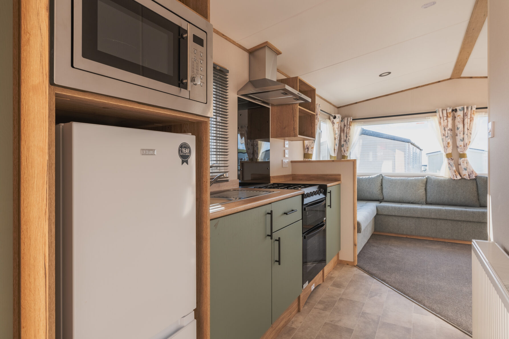 The kitchen is contemporary and is fitted with modern wood effect units and plenty of worktop space, including a gas oven and hob, microwave and fridge freezer. Opposite the fixed seating provides perfect space for 4 people to sit back and enjoy a lovely meal.
