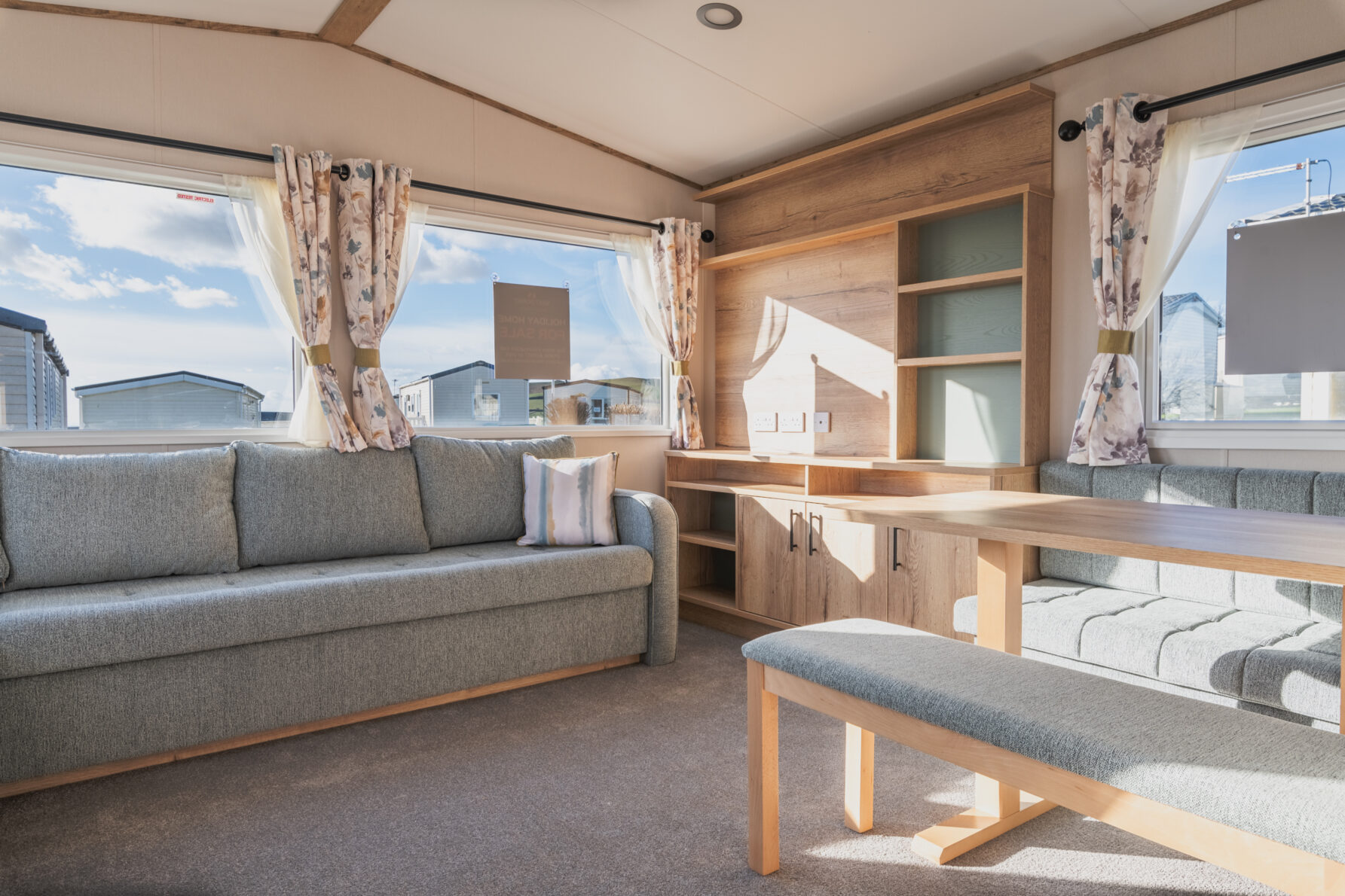 The lounge area is in keeping with the same modern furnishing throughout, plenty of warm light floods in from the large, fixed window. Sit back and relax on the large L-Shape sofa to watch some TV or perhaps a board game with the family.