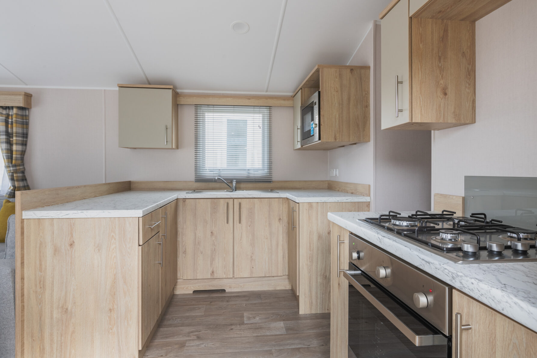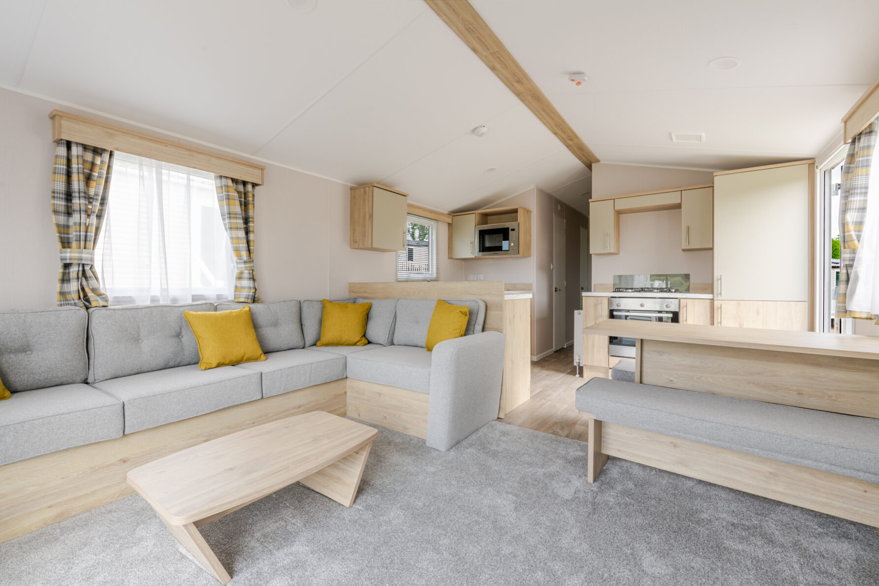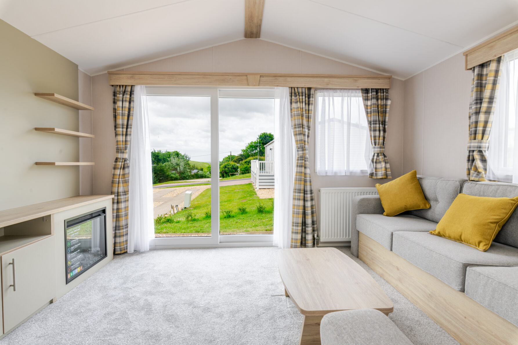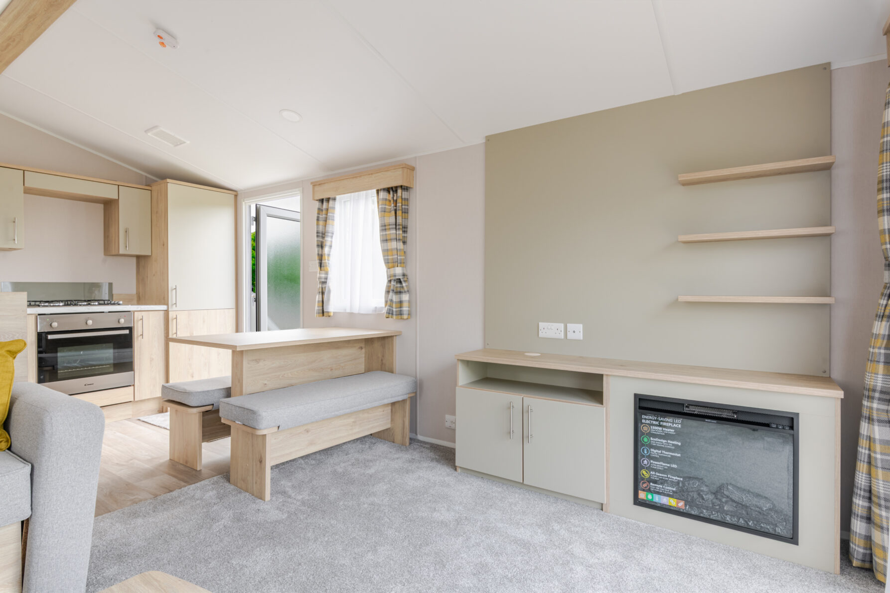 A Comfortable and spacious lounge area with an L Shaped sofa and coffee table, along with fire place and space for the TV. Relax and unwind while deciding on your next adventure. There are sliding doors from the lounge out onto the south facing decking area.