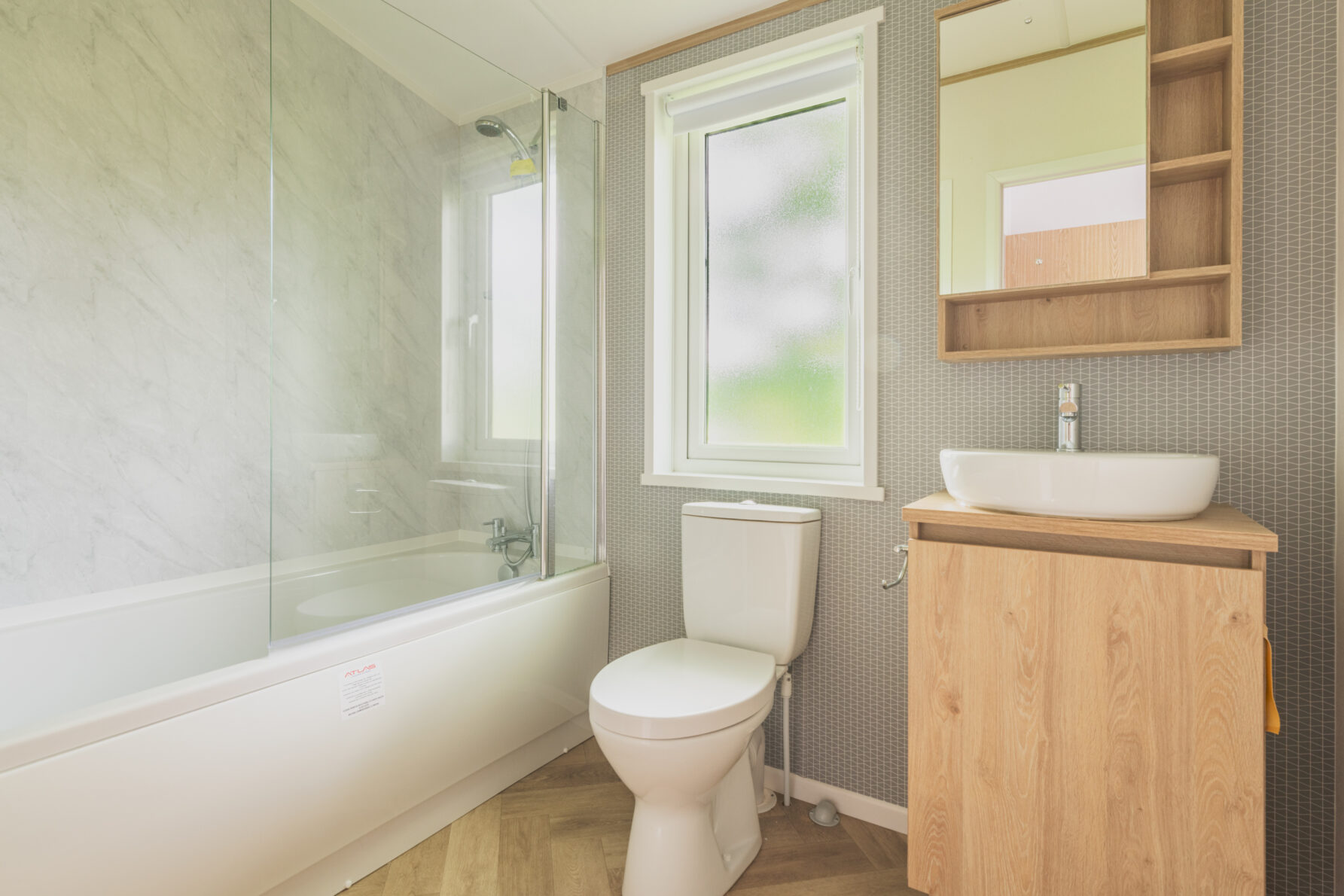 As well as your en-suite in the master bedroom, this lodge has a large central family bathroom where you’ll see the shower over bath, WC and washbasin/vanity unit.