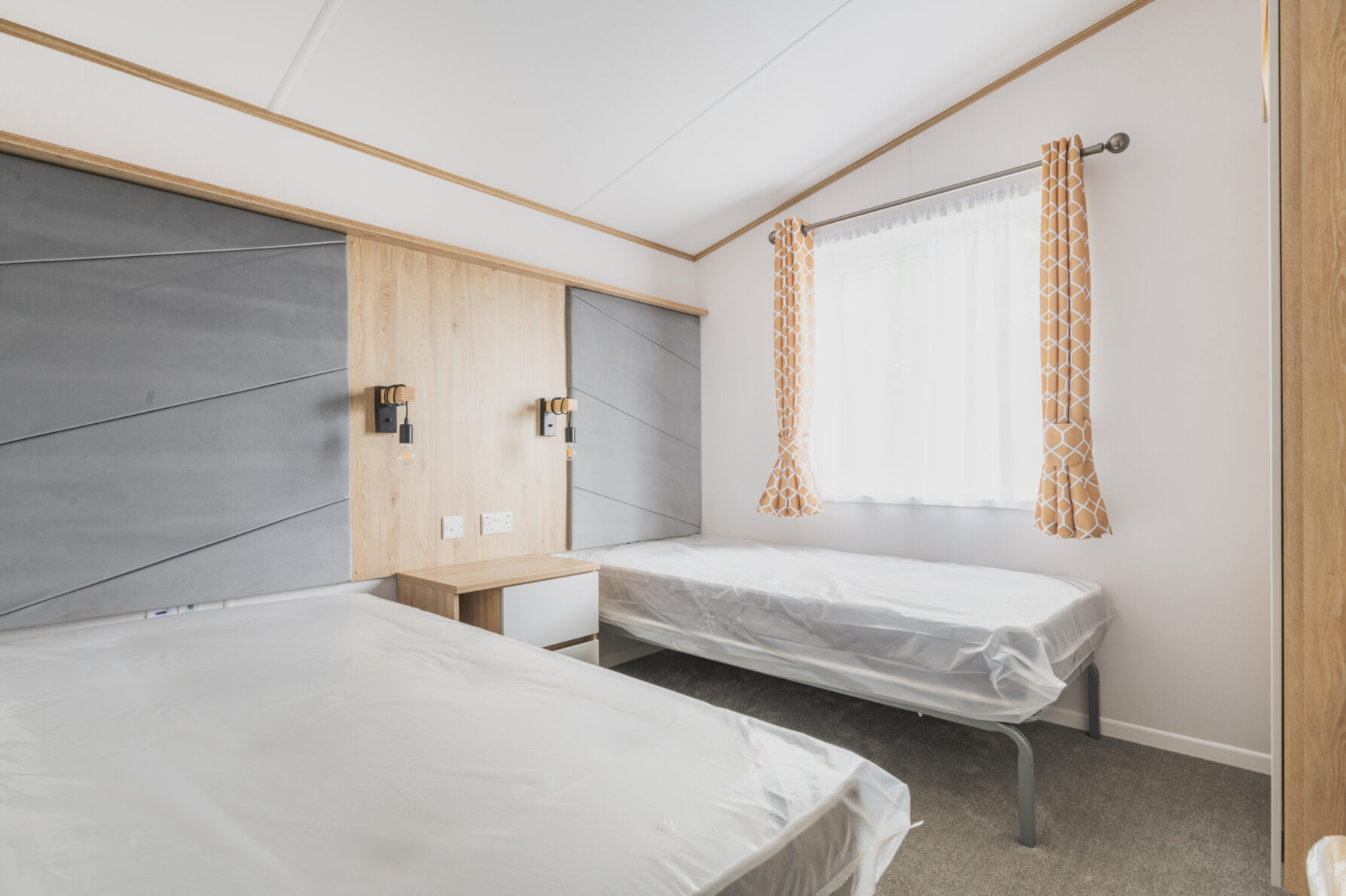 The master bedroom features a king-size bed and boasts a very unique layout that you don’t come across often. To the left of your bed is a large mirror style false wall, which slides back to reveal a spacious en-suite and large storage spaces. The twin room features large single beds and plenty of natural light, creating a welcoming appeal.