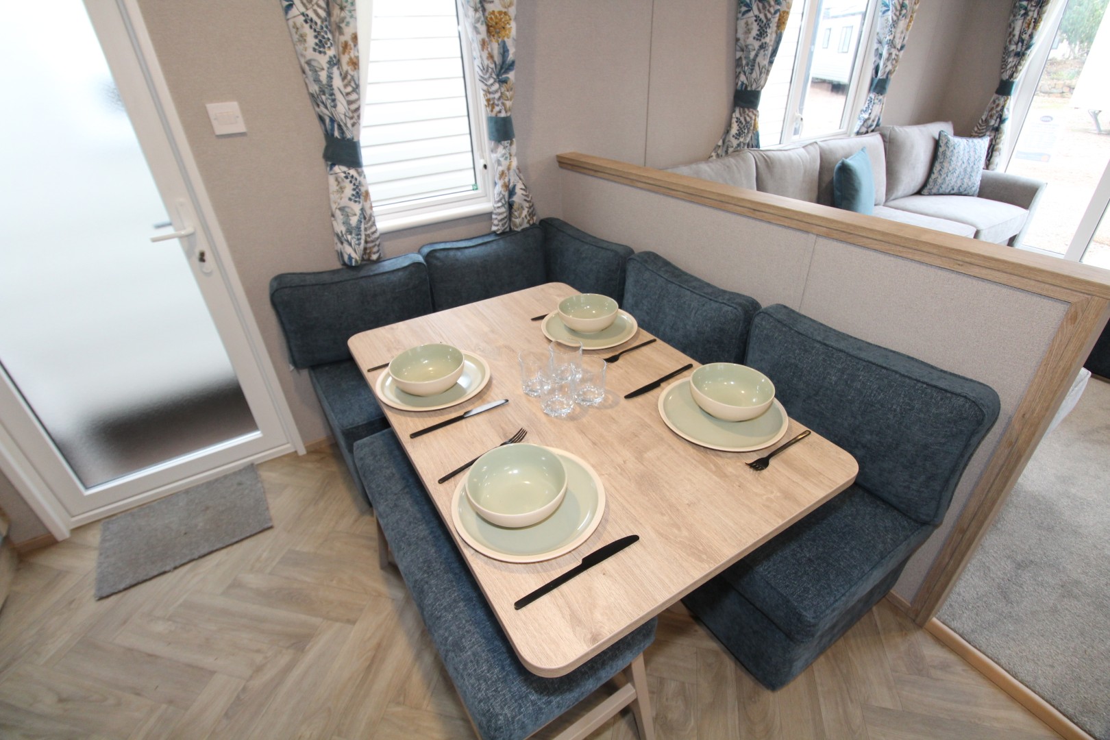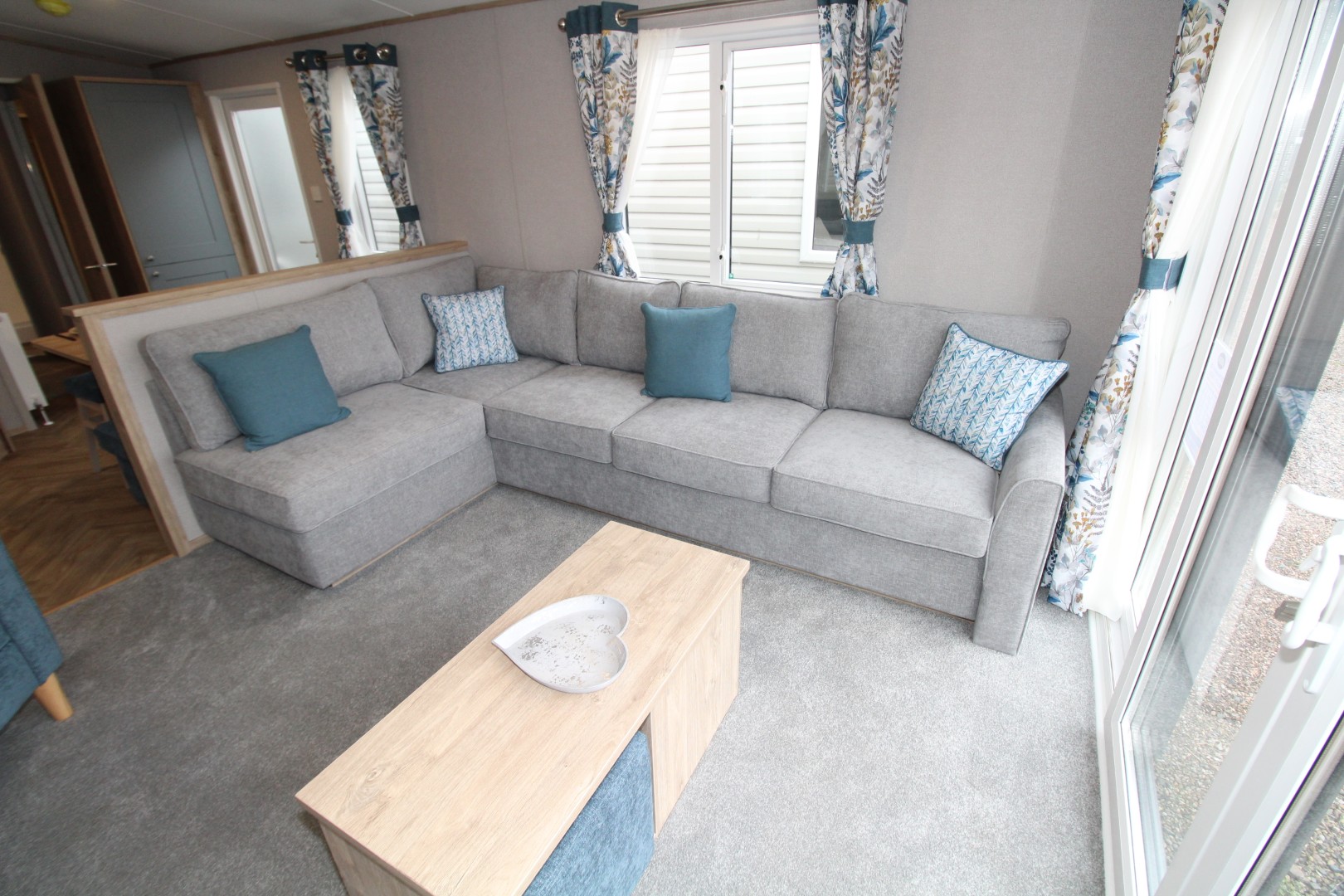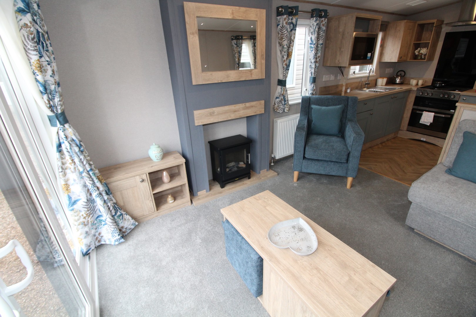 Inside, the Wimbledon feels light and inviting thanks to its large windows, soft colour scheme and thoughtful layout. The lounge is centred around a luxury wood burner-style feature fire with plenty of comfortable seating and a USB socket for easy device charging. Carpet underlay throughout adds warmth and stylish light fittings with low-energy bulbs help to create a cosy evening atmosphere.
