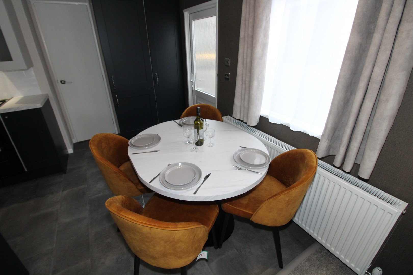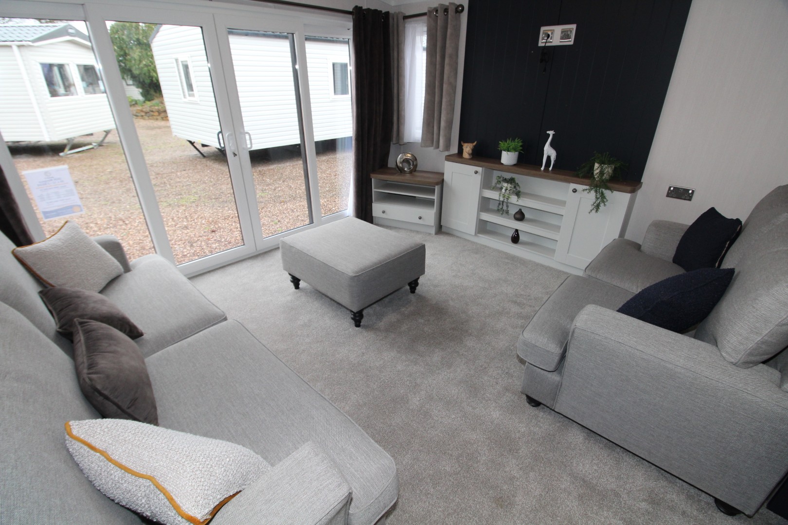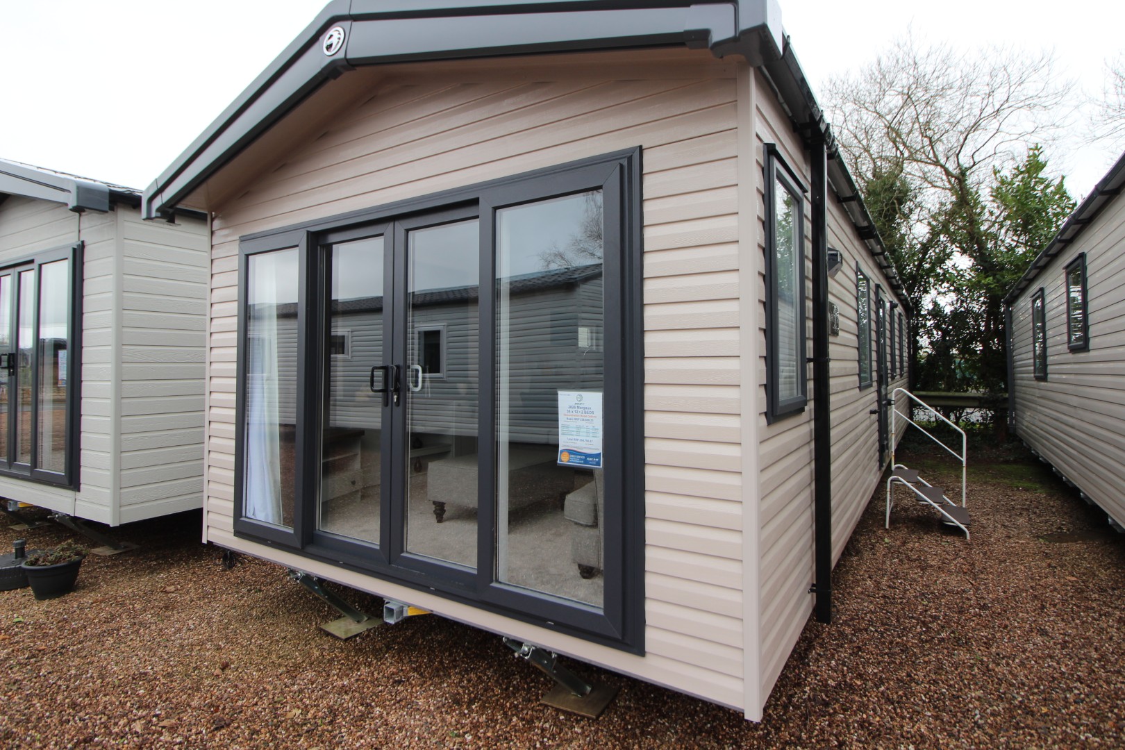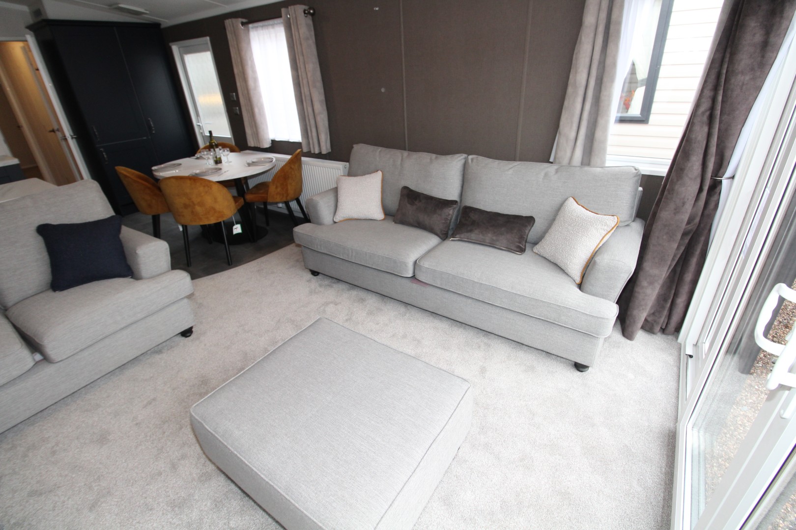 The stunning exterior features Sandy Beige aluminium cladding, LED front bargeboard lighting and full heigh front aspect windows that fill the spacious lounge with plenty of natural light. Inside, you'll find elegant Provenza flooring, Tobacco Halifax oak woodgrain with Indigo accents, and the sophisticated Town House soft furnishing scheme, creating a calm and contemporary space to relax in.