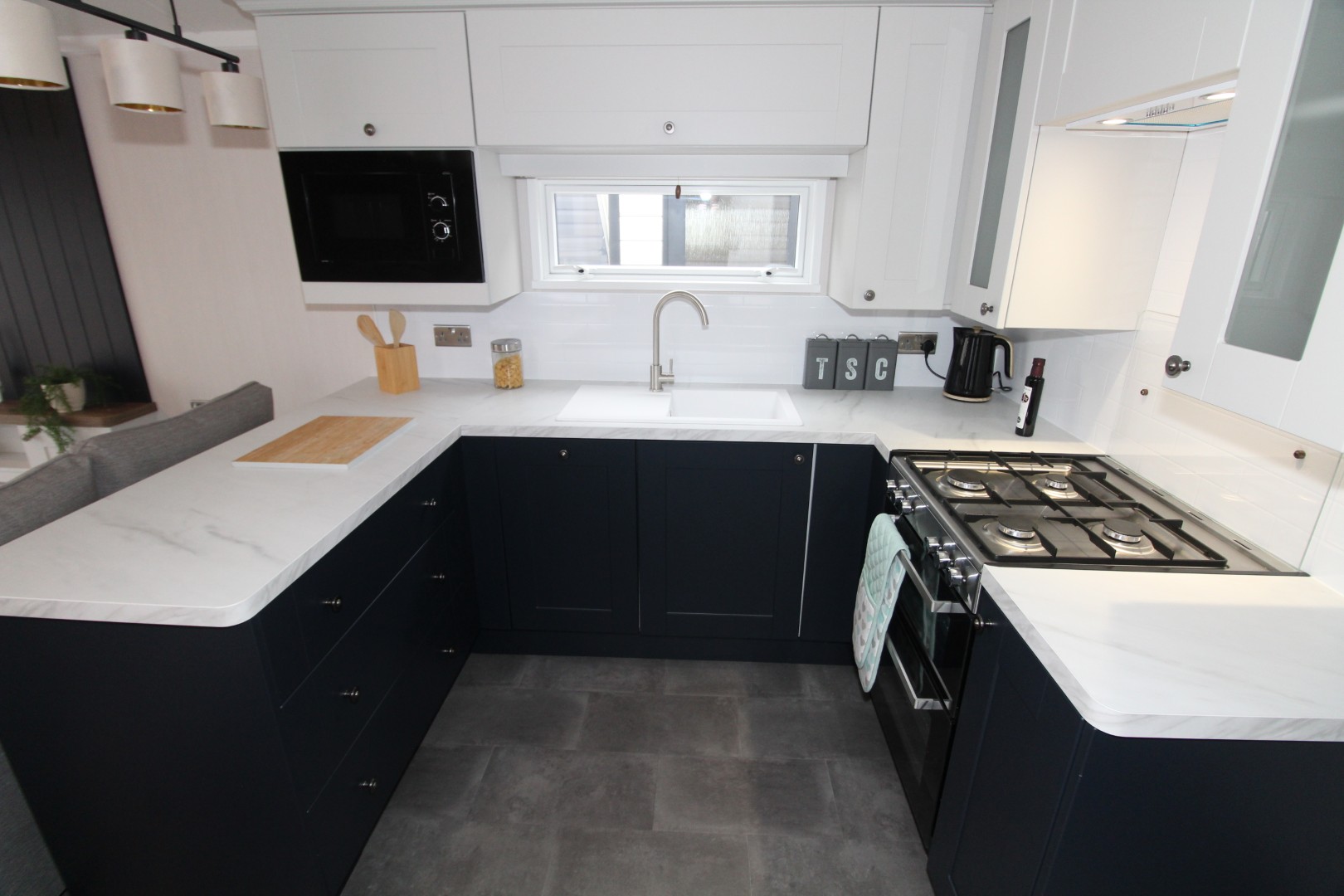In the kitchen, you'll find sleek 'U'-shaped units with soft-close doors and drawers, Levanto marble-effect worktops, a while tile splashback and integrated appliances including a microwave oven and fridge freezer. Pendant lighting and brushed steel fittings add a refined and modern touch.
