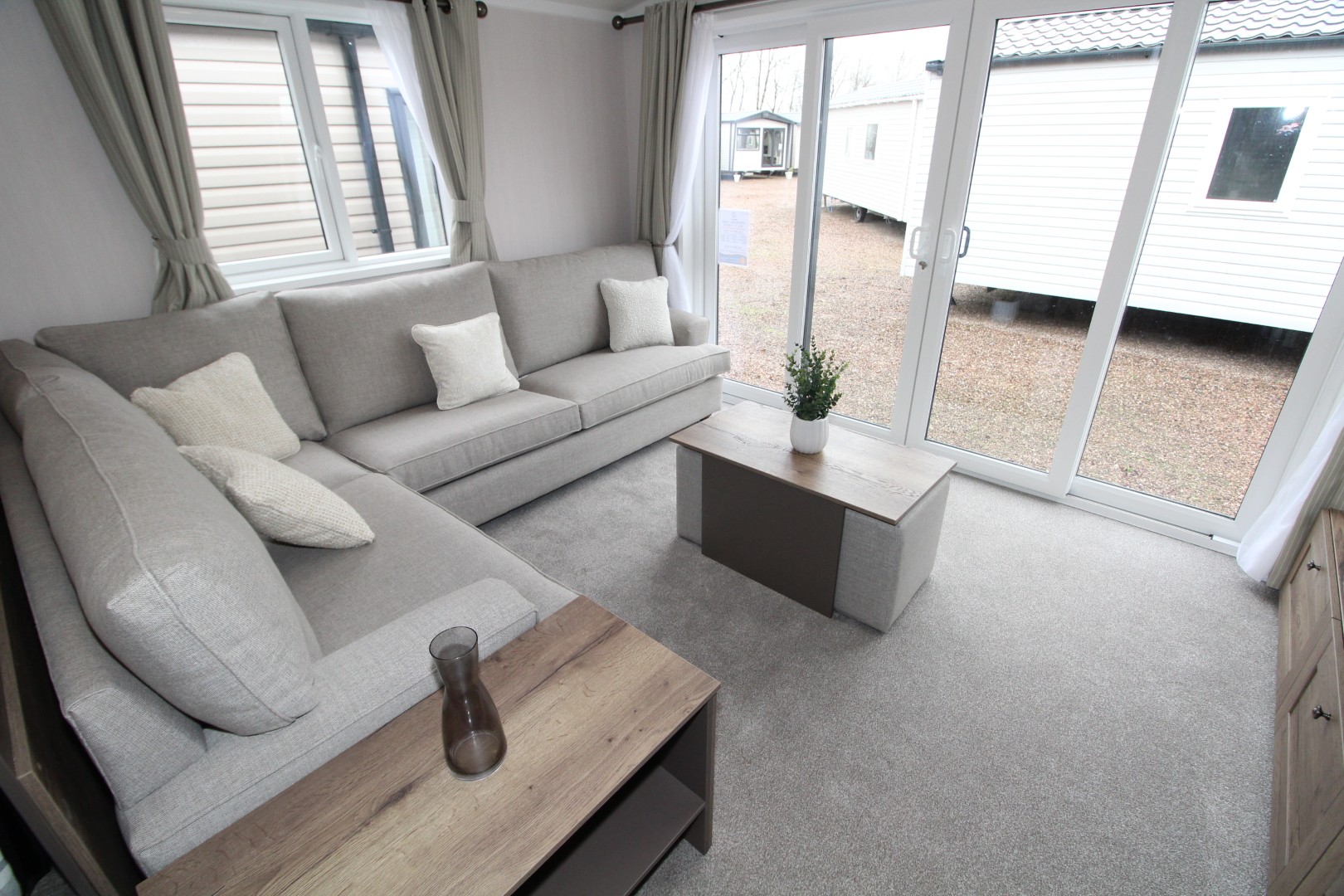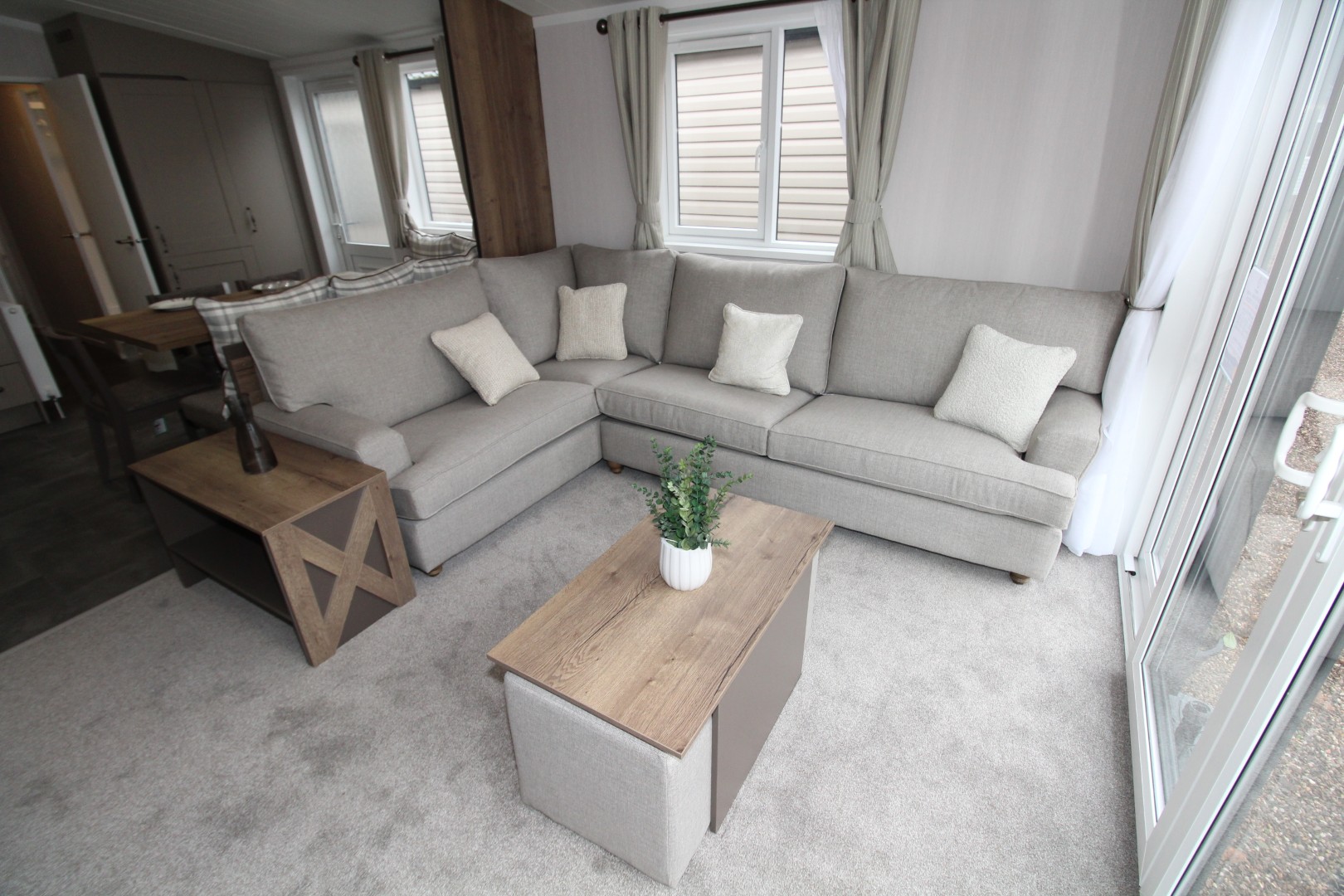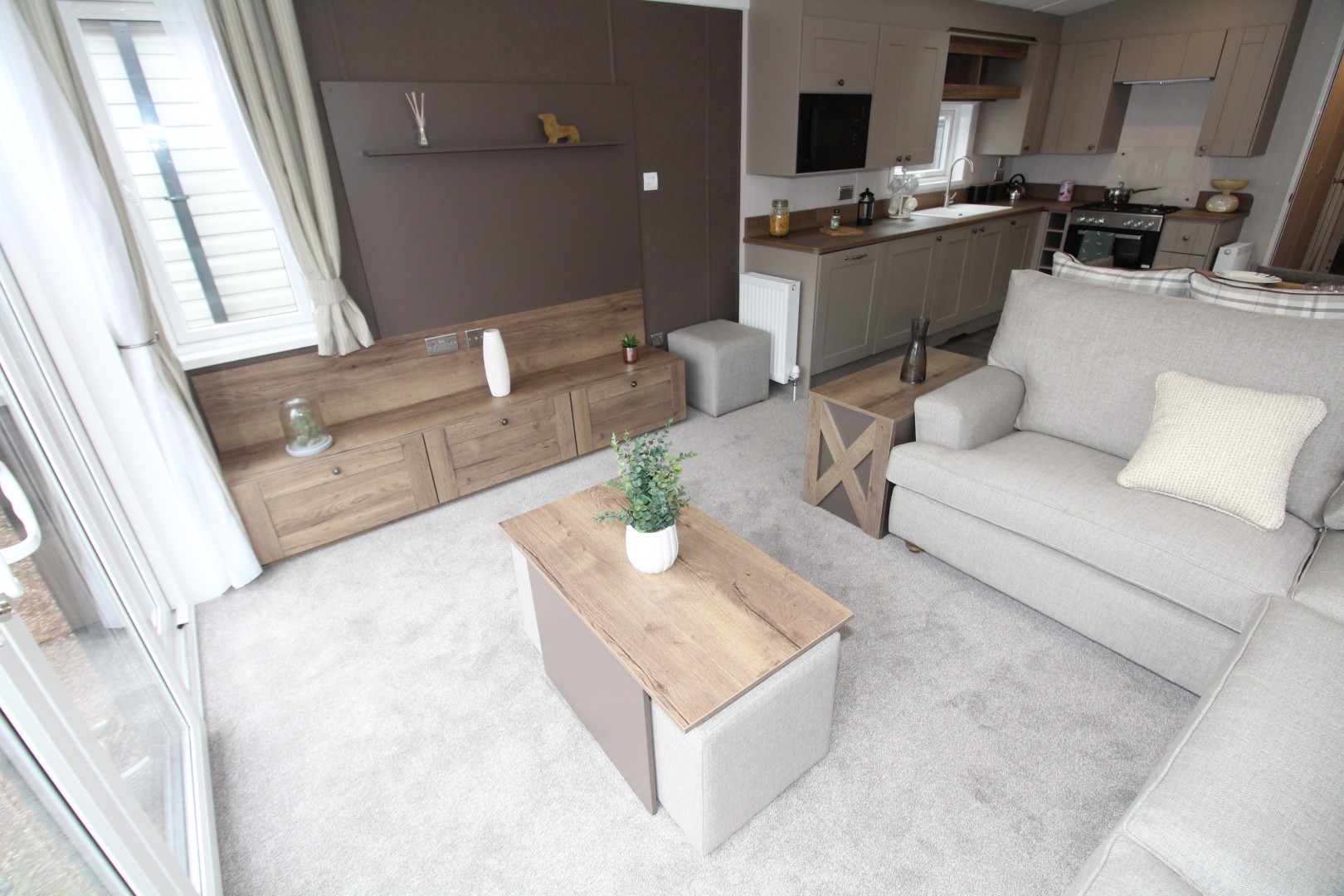 Inside, the Morlaix Lodge is beautifully crafted with a Farmhouse soft furnishing scheme, creating a homely and inviting atmosphere. The spacious open-plan living area features a large L-shaped Valentina freestanding sofa with scatter cushions, a matching coffee table and side table and a stylish TV unit with overhead shelving. Large front aspect sliding doors flood the room with natural light, seamlessly connecting the indoor living space with the outdoors.