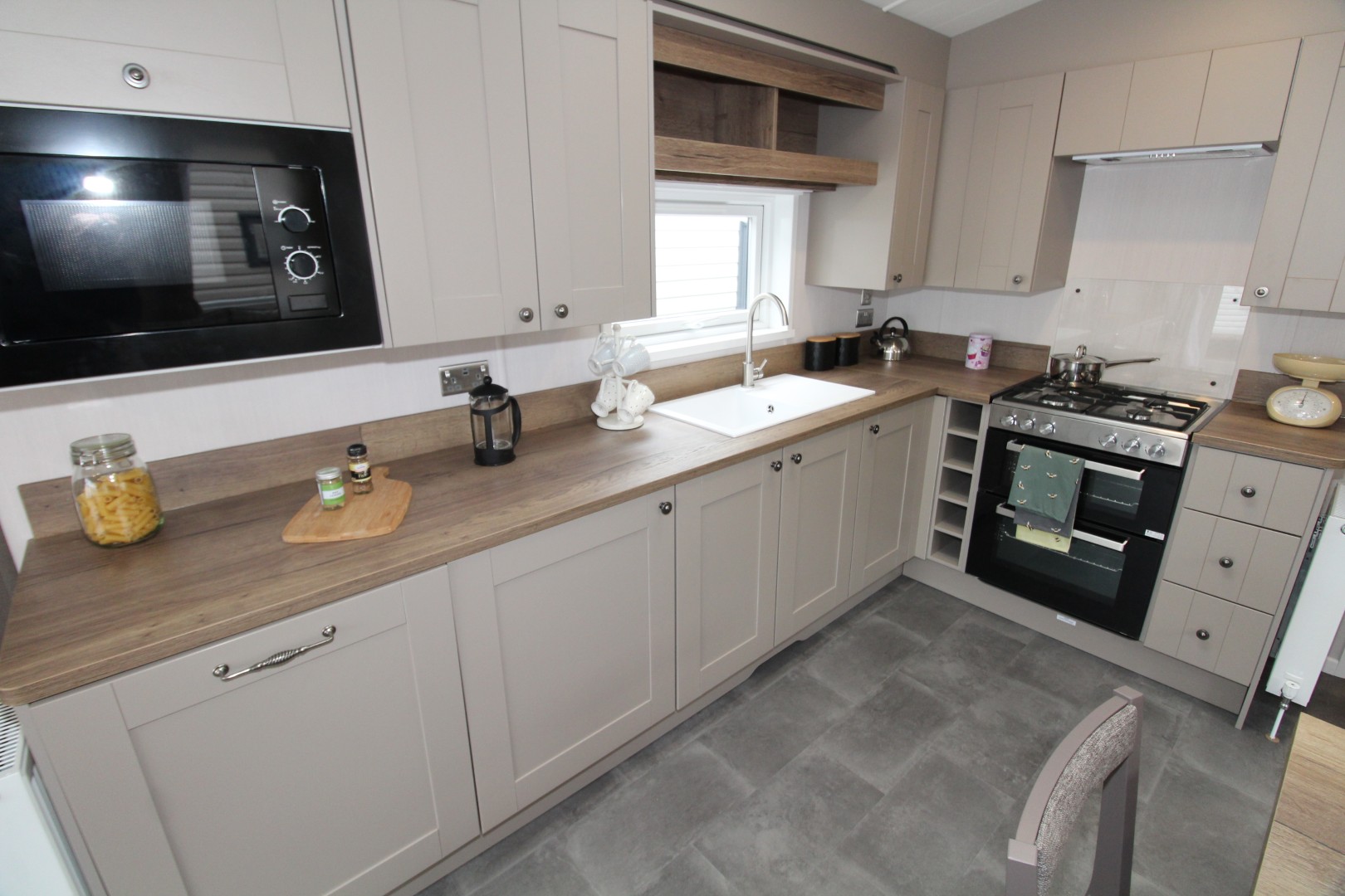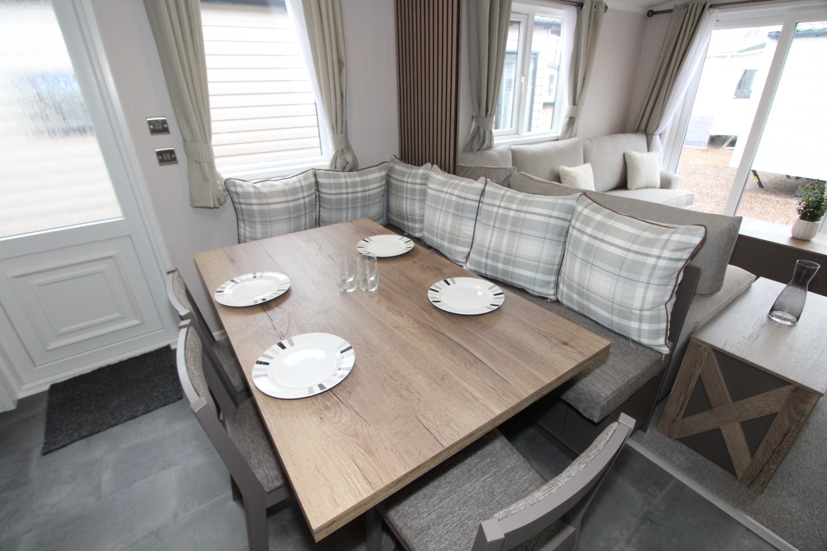 The shaker-style kitchen is both practical and elegant, fitted with soft-close doors, stylish worktops and matching splashbacks. It comes fully equipped with an integrated microwave, fridge freezer, glass-fronted oven, grill and a four-burner gas hob with an externally vented cooker hood. A freestanding dining table with wrap-around bench seating and three cushioned chairs provides a comfortable area for family meals and social gatherings.