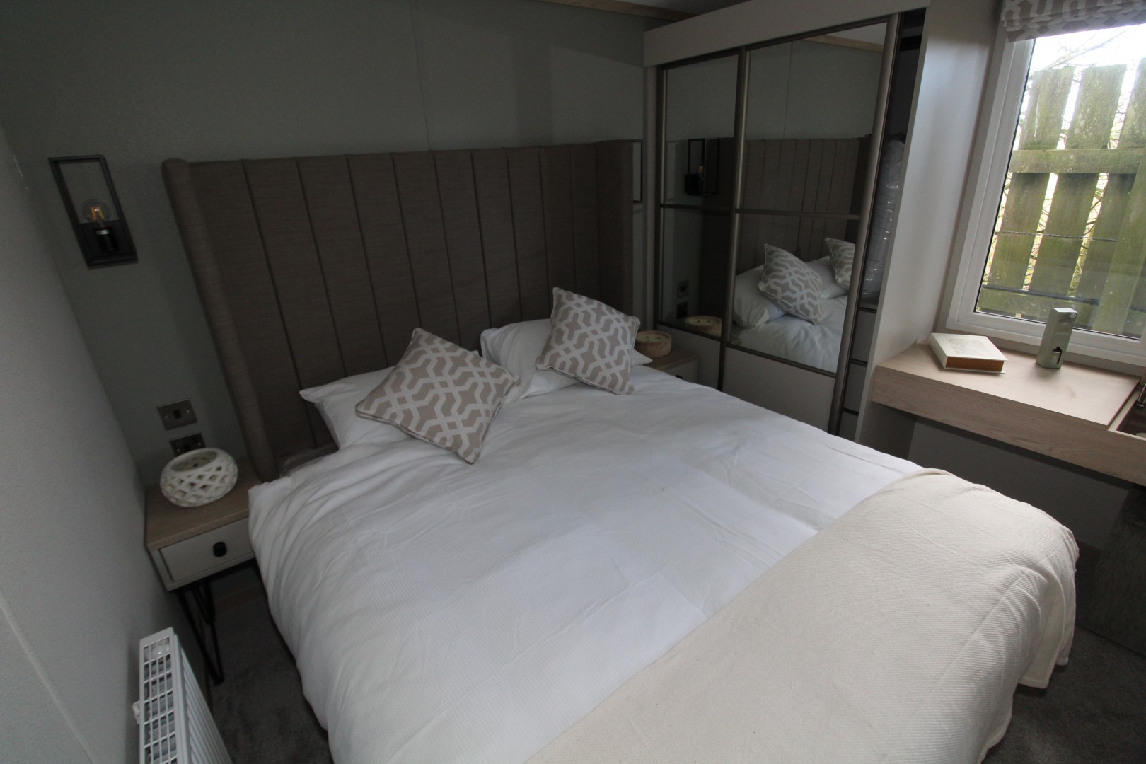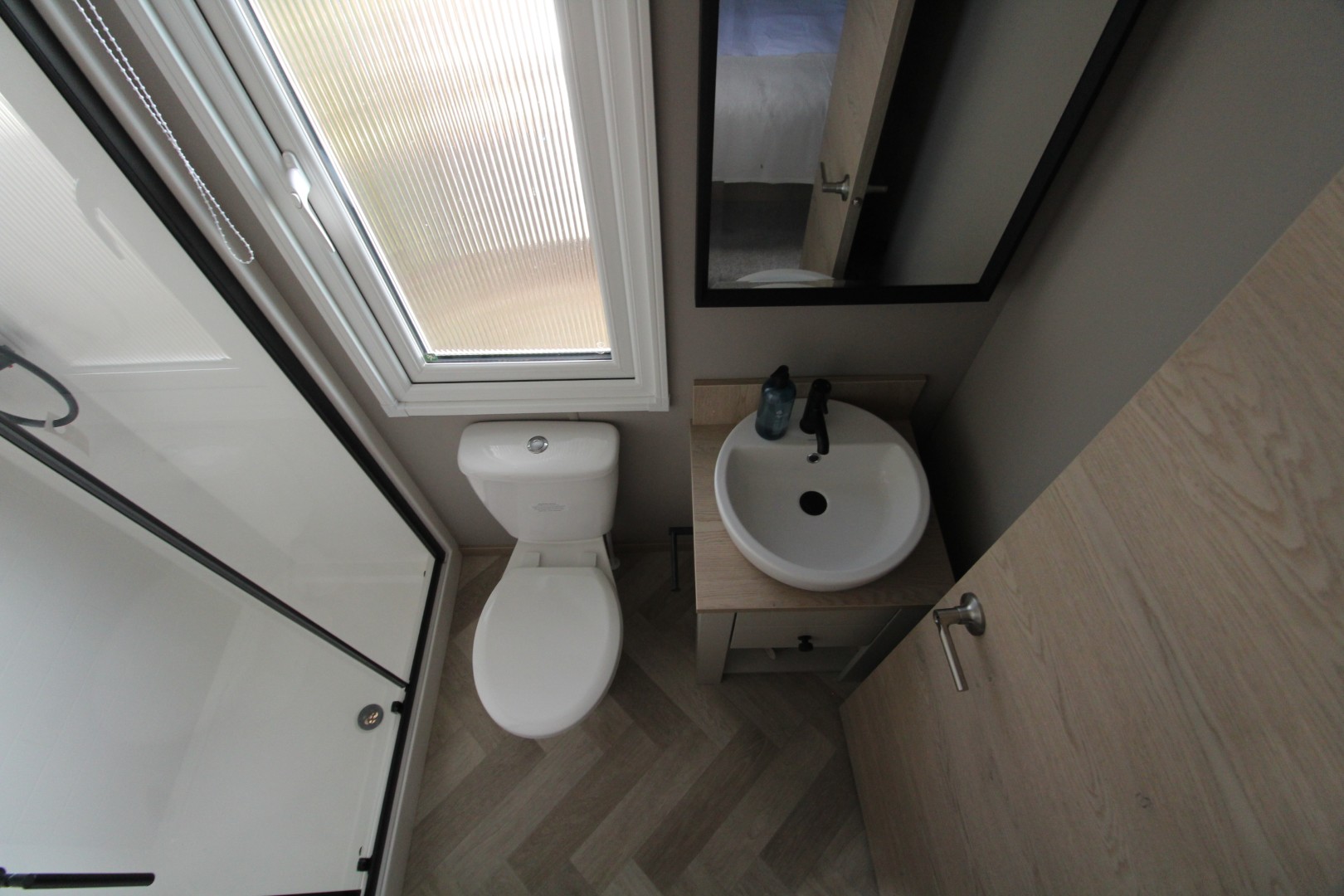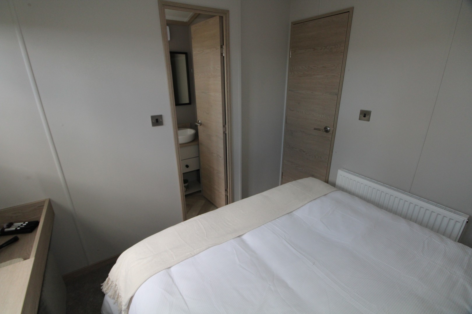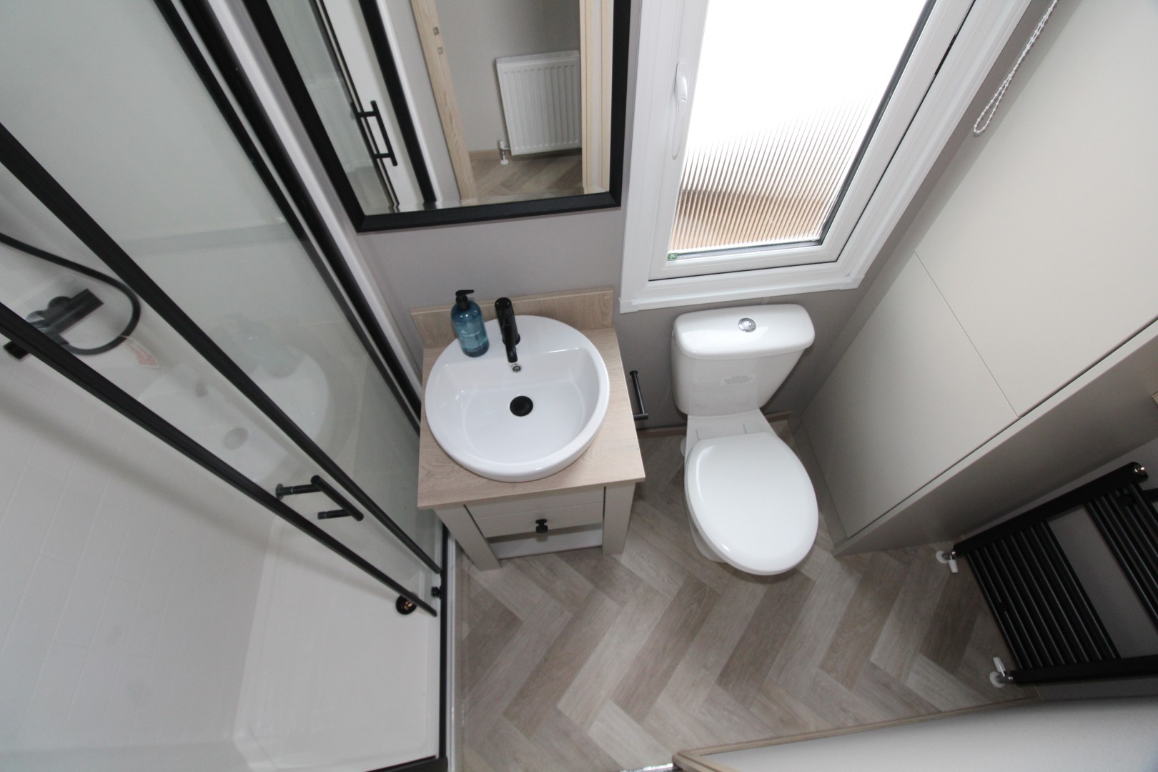 The bathrooms are fresh and contemporary, combining matt black fixtures with soft wood tones and spa-like finish, while the bedrooms are calm, comfortable retreats. The master suite offers a statement headboard, mirrored wardrobes and dressing area, while additional twin rooms in the 8-berth layout provide flexible sleeping arrangements for family or guests.