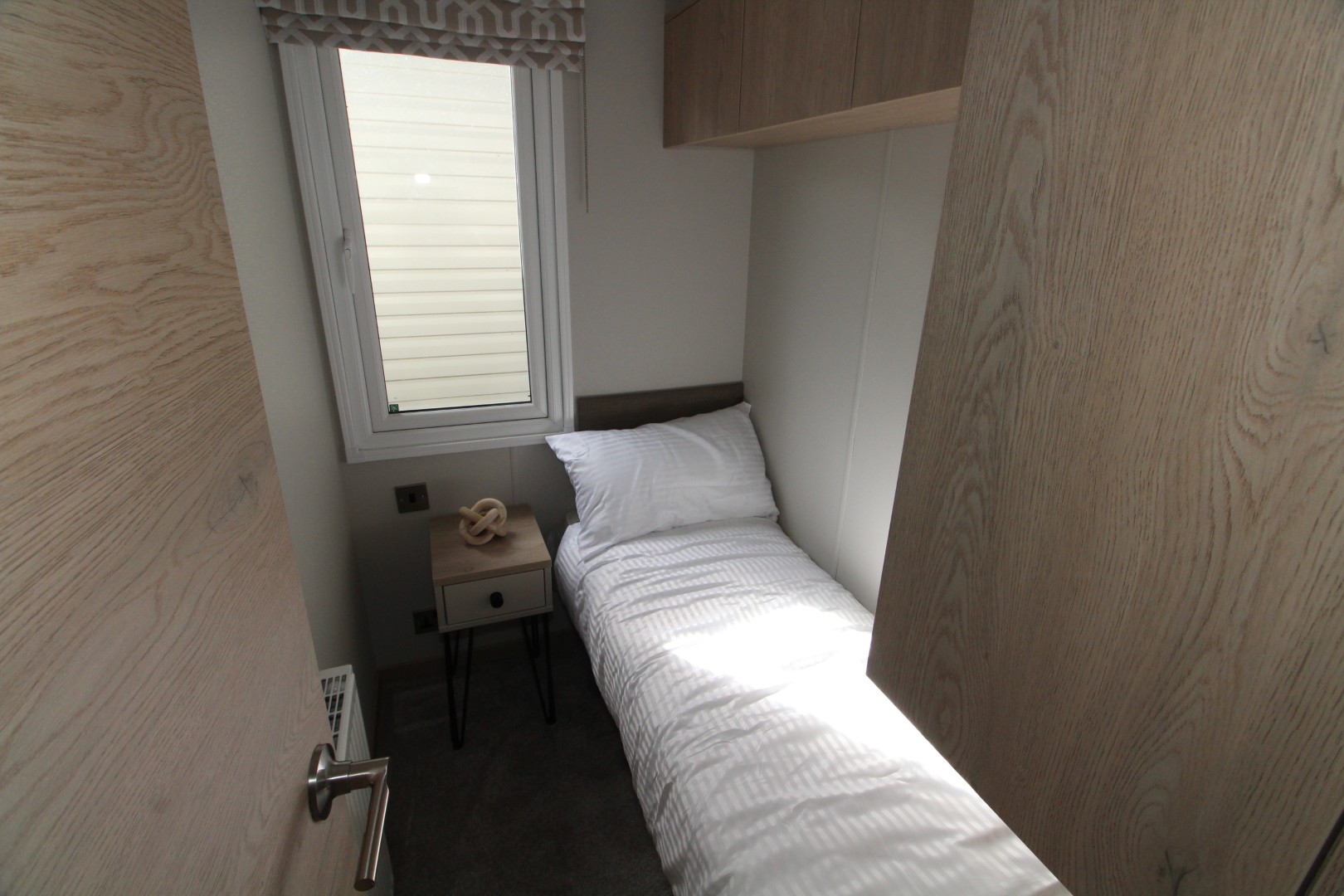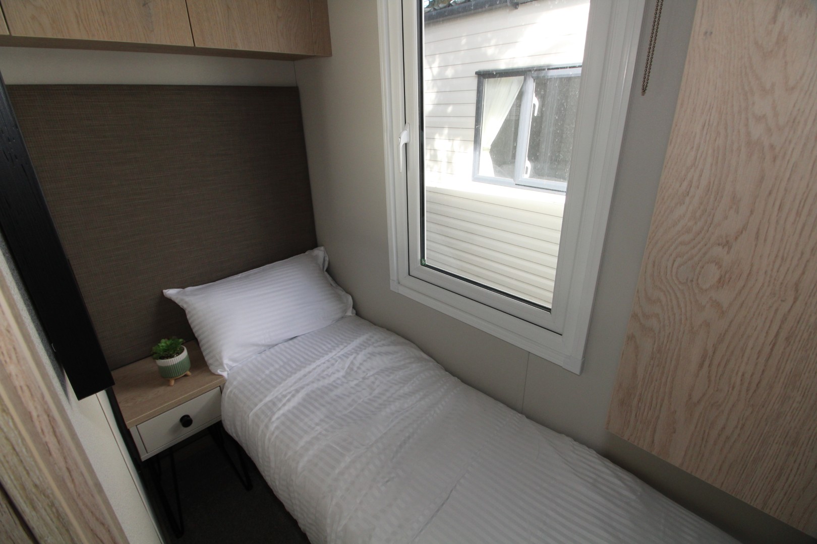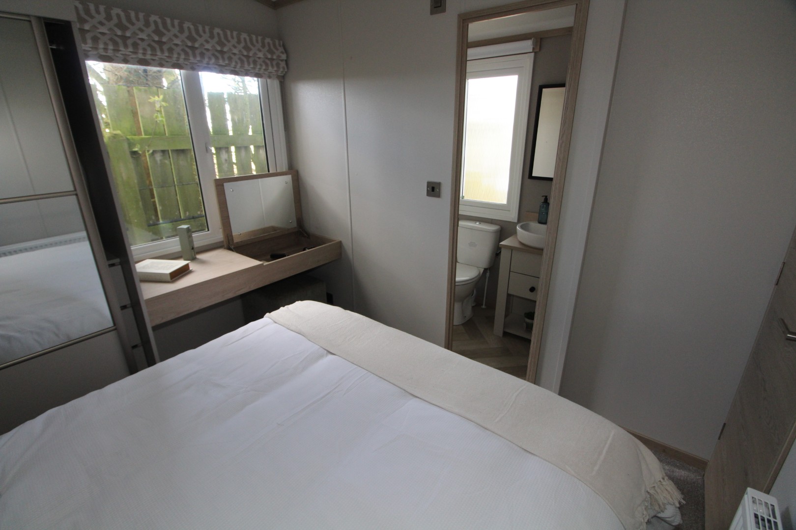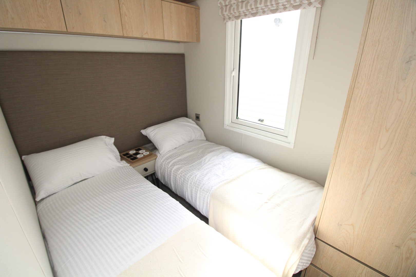 The bathrooms are fresh and contemporary, combining matt black fixtures with soft wood tones and spa-like finish, while the bedrooms are calm, comfortable retreats. The master suite offers a statement headboard, mirrored wardrobes and dressing area, while additional twin rooms in the 8-berth layout provide flexible sleeping arrangements for family or guests.