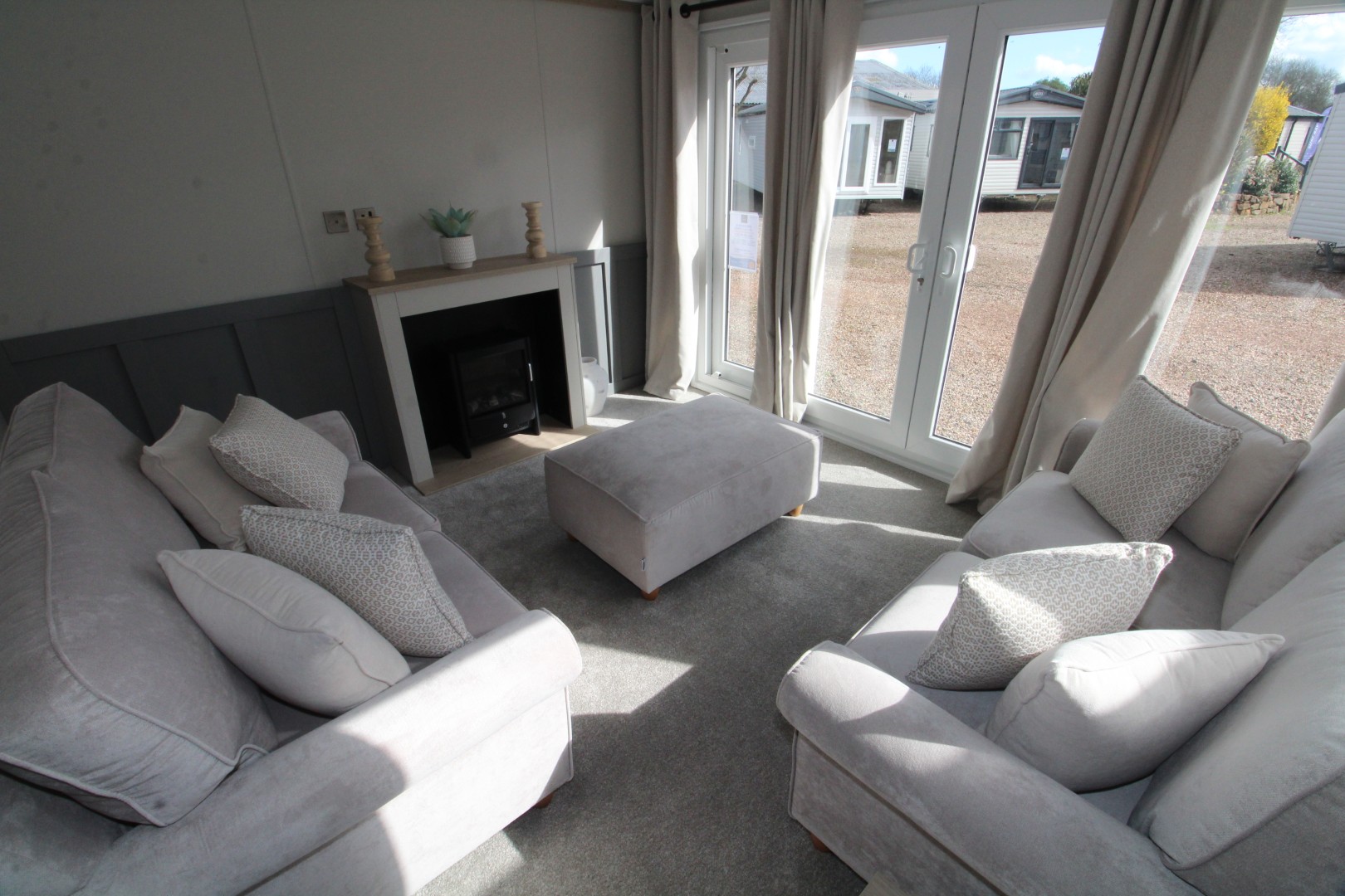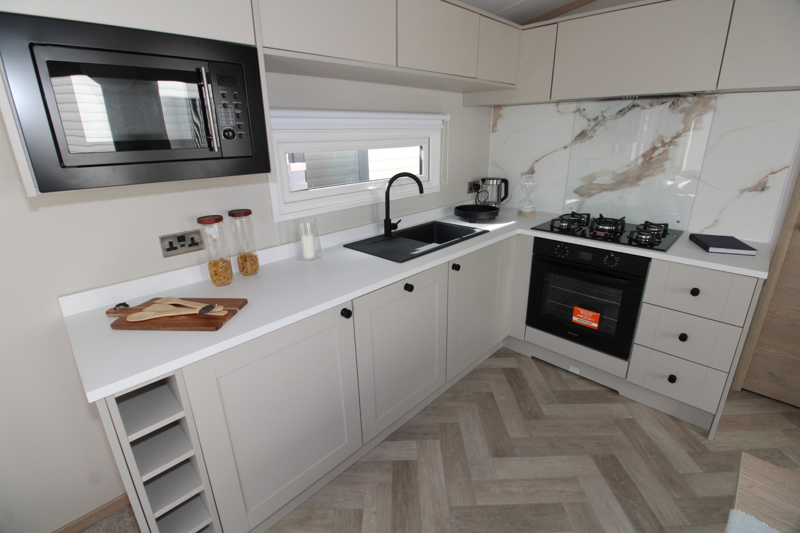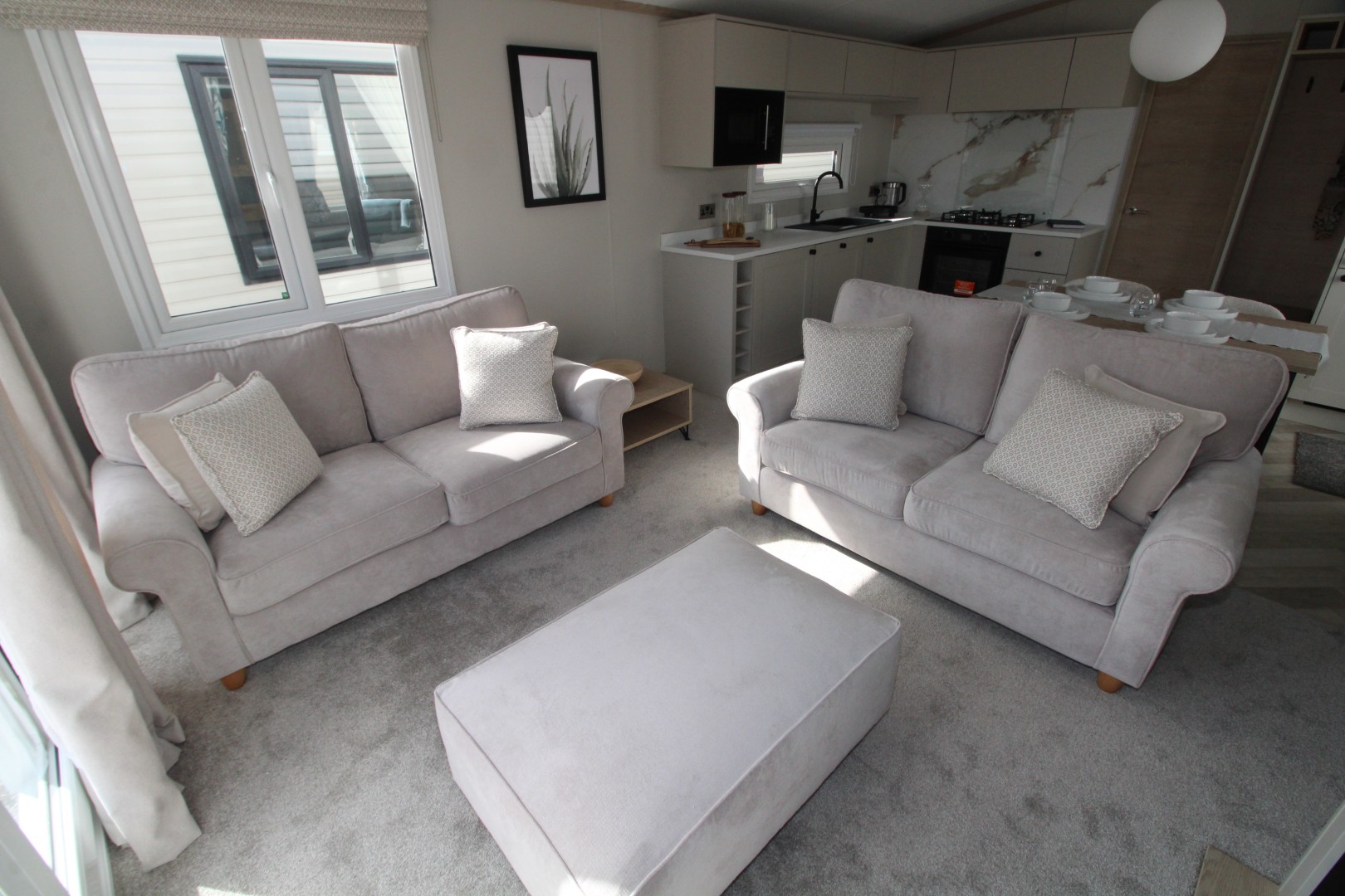 The spacious lounge features two comfortable sofas, a contemporary fireplace and large French doors that flood the room with natural light - ideal for both quiet evenings and sociable weekends away. The open-plan kitchen and dining area continue the elegant theme, with sleek cabinetry, a marble-effect splashback and integrated appliances providing the perfect blend of practicality and modern style.