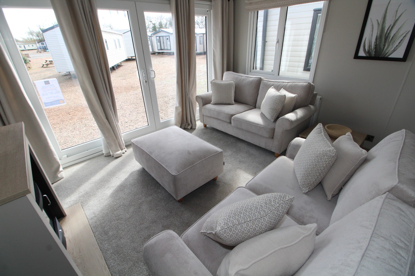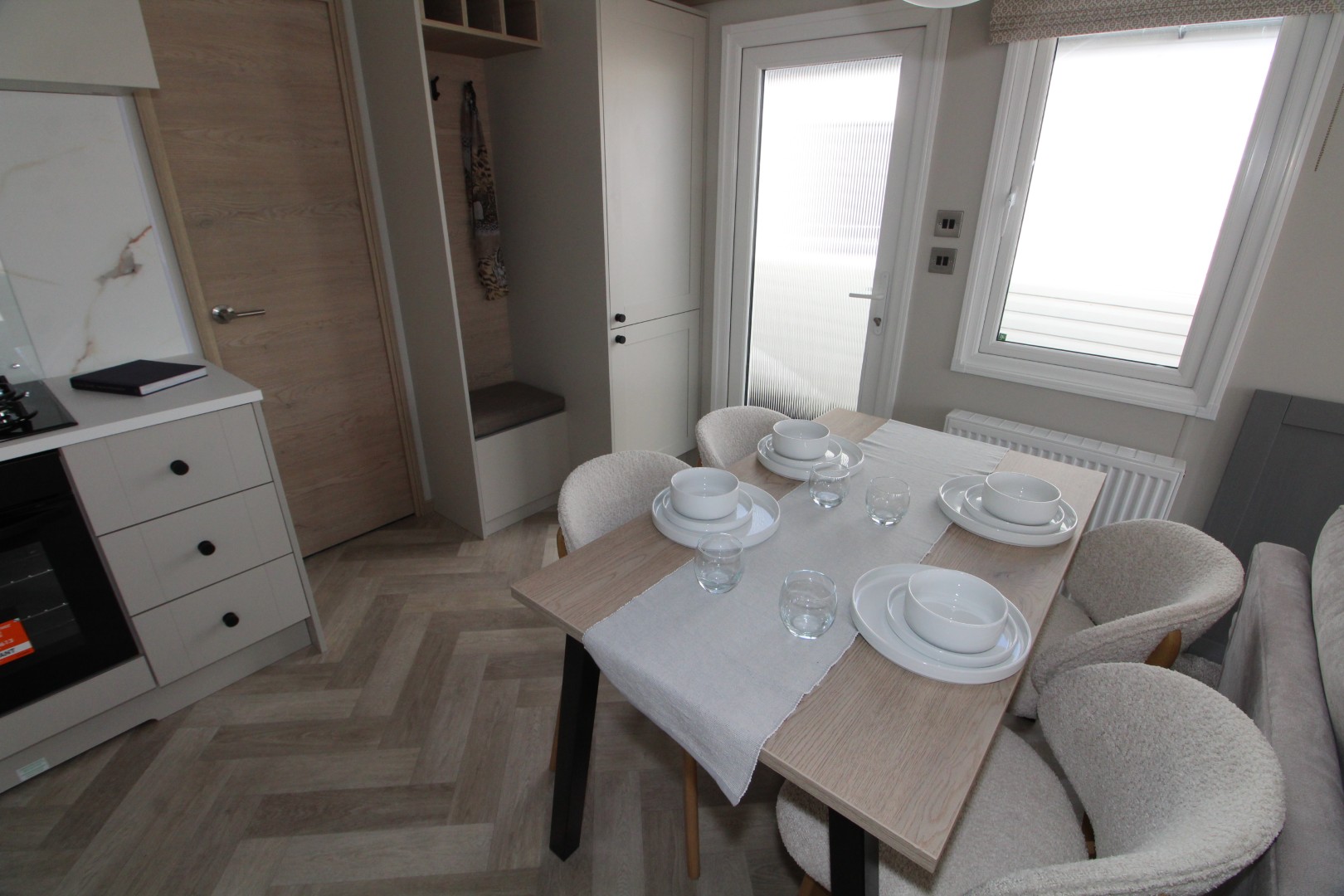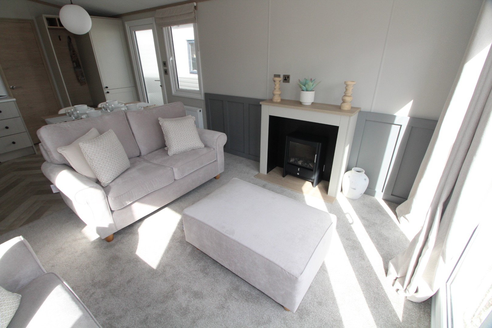The spacious lounge features two comfortable sofas, a contemporary fireplace and large French doors that flood the room with natural light - ideal for both quiet evenings and sociable weekends away. The open-plan kitchen and dining area continue the elegant theme, with sleek cabinetry, a marble-effect splashback and integrated appliances providing the perfect blend of practicality and modern style.