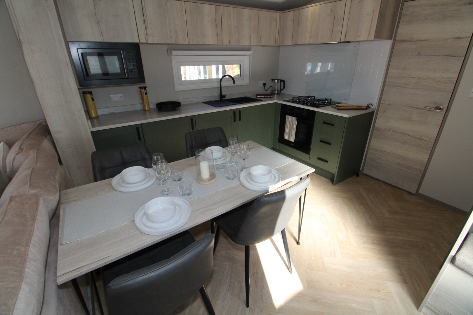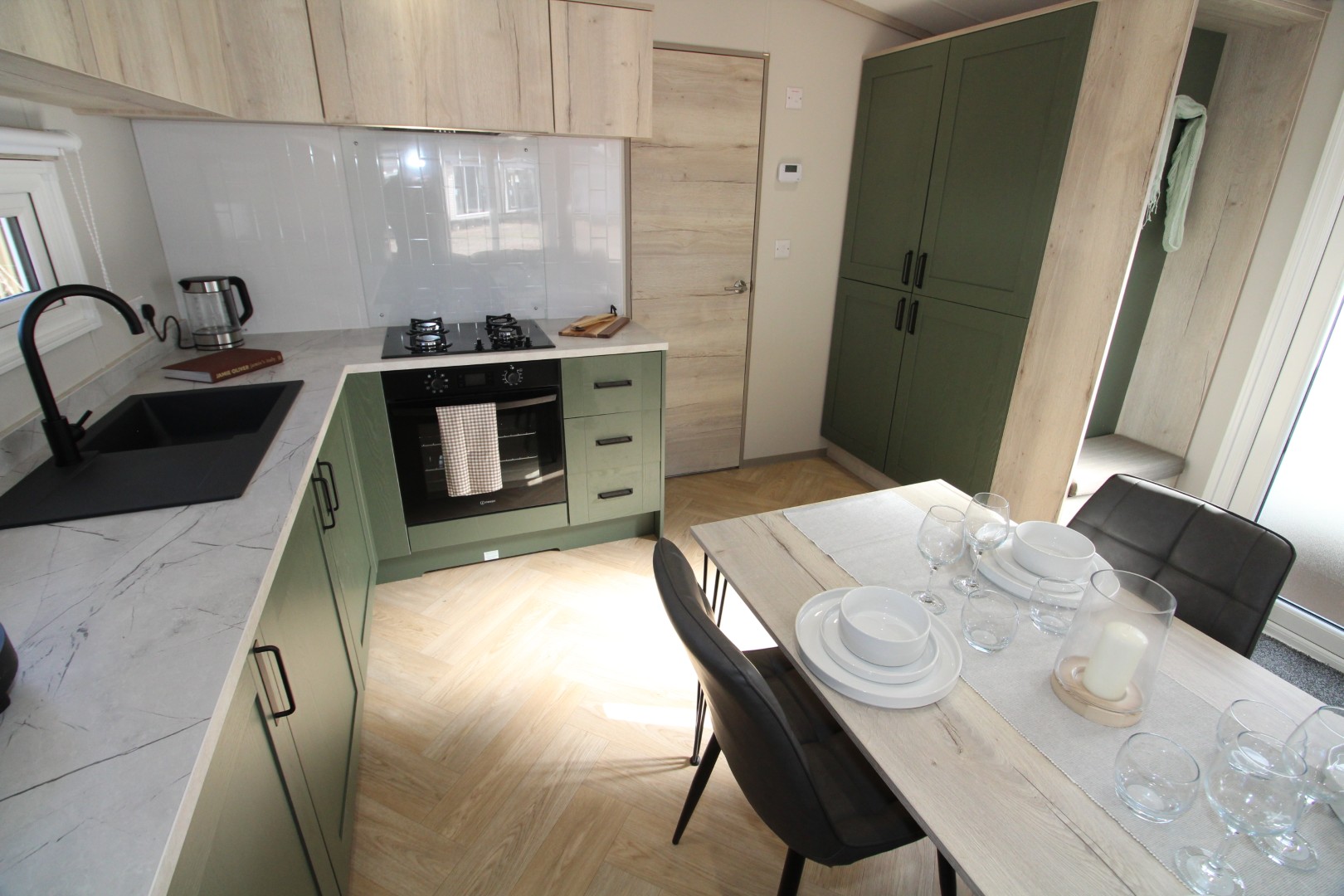 Inside, you're greeted by an uplifting open-plan space where the kitchen, dining and living areas flow seamlessly together. Neutral tones, warm wood accents and rich green hues create a soothing atmosphere, while thoughtful details ensure every inch feels both stylish and functional.
